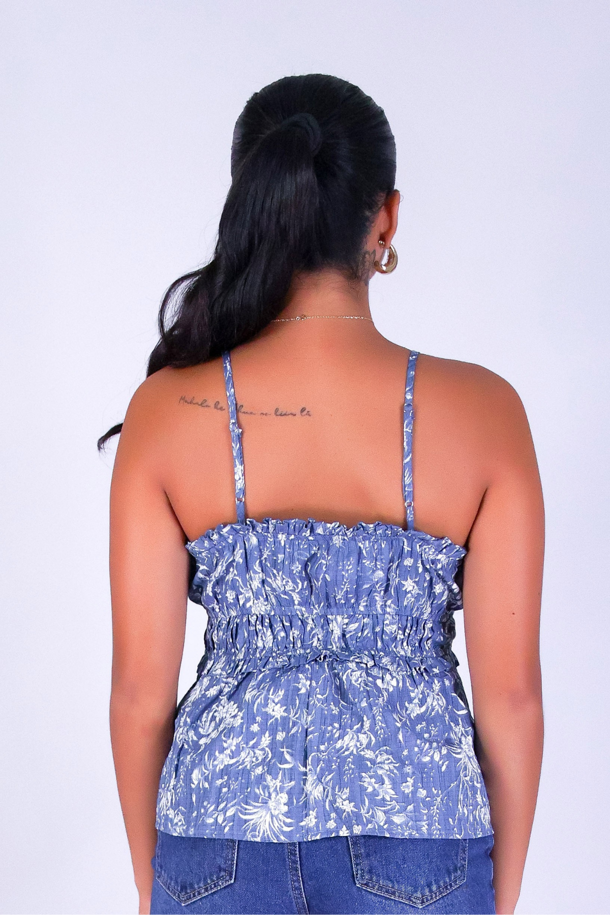 DARLING BLOOM BABYDOLL TOP is available in color DENIM and in size SMALL, MED, LARGE.
