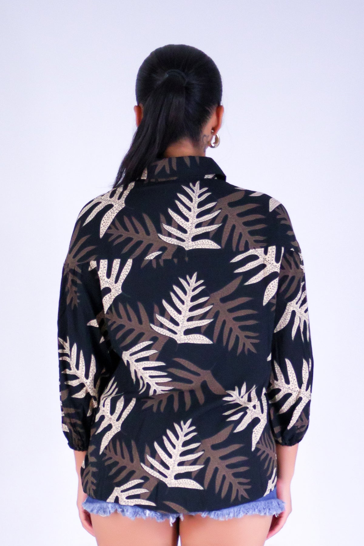 LAUA'E BUTTON DOWN TOP is available in color BLACK and in size SMALL, MED, LARGE.