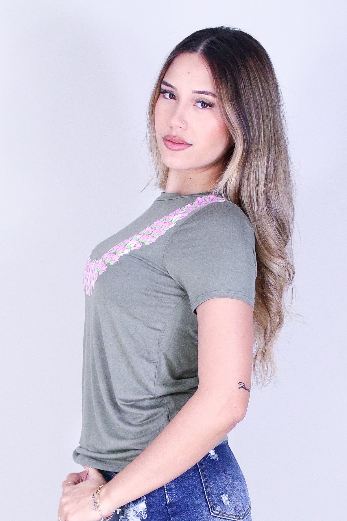 LOKELANI LEI TEE is available in color OLIVE and in size SMALL, MED, LARGE, XL.