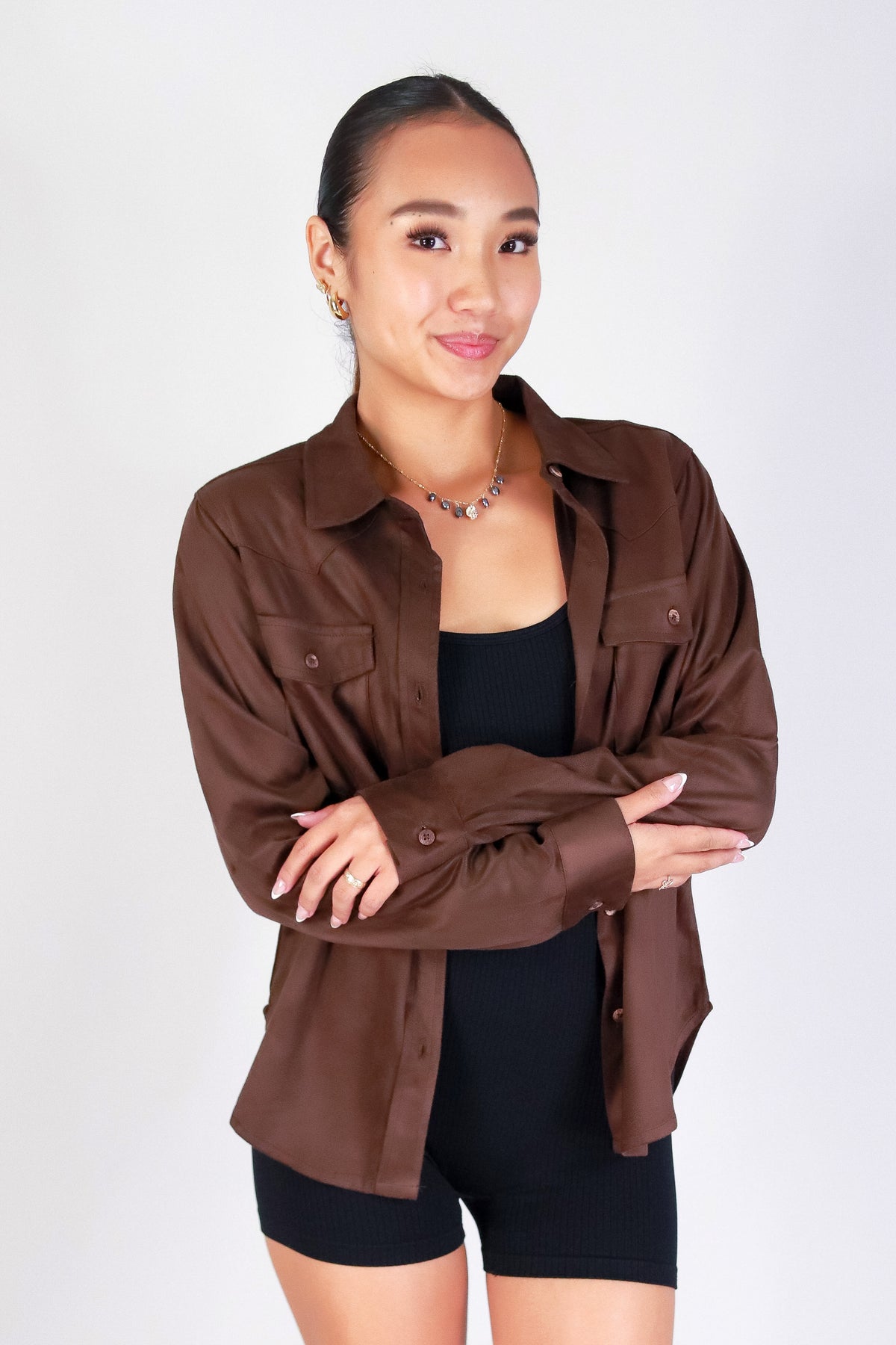 MOON DRIFT SUEDE LONG SLEEVE TOP is available in color BROWN and in size SMALL, MED, LARGE, XL.