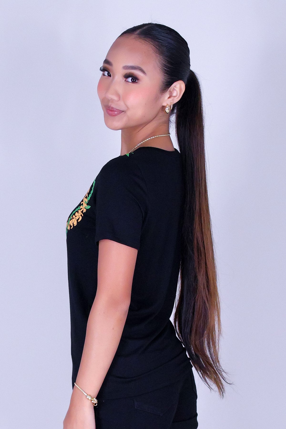 PUAKENIKENI TI LEAF LEI TEE is available in color BLACK and in size SMALL, MED, LARGE, XL.