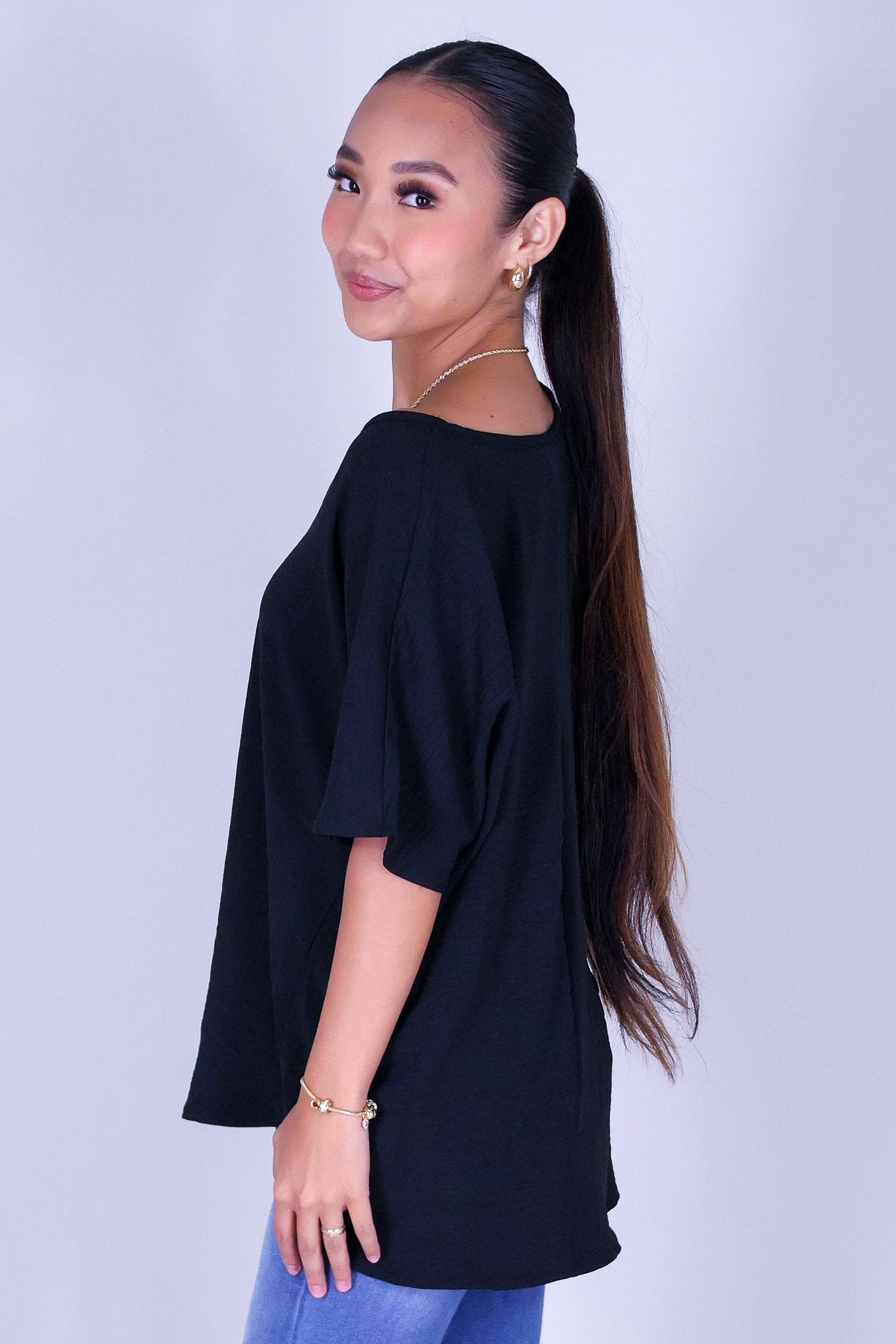 SUMMER CLASS V-NECK TOP is available in color BLACK and in size SMALL, MED, LARGE, XL.