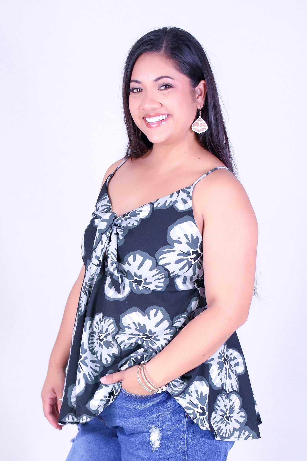WATERCOLOR HIBISCUS TIE FRONT TOP is available in color BLACK and in size 1X, 2X, 3X.