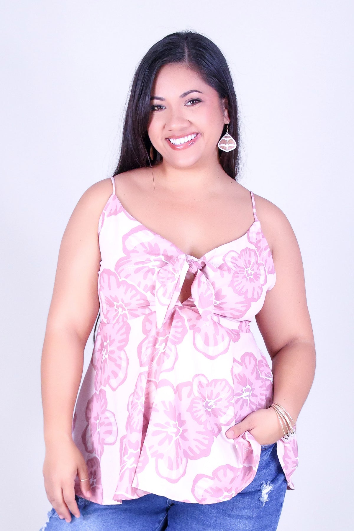 WATERCOLOR HIBISCUS TIE FRONT TOP is available in color PINK and in size 1X, 2X, 3X.