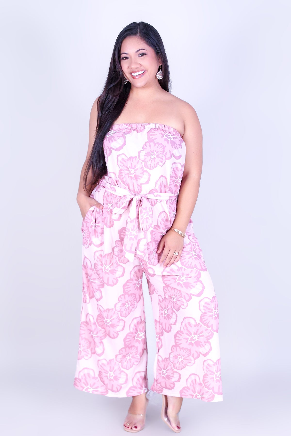 WATERCOLOR HIBISCUS TUBE JUMPSUIT is available in color PINK and in size 1X, 2X, 3X.