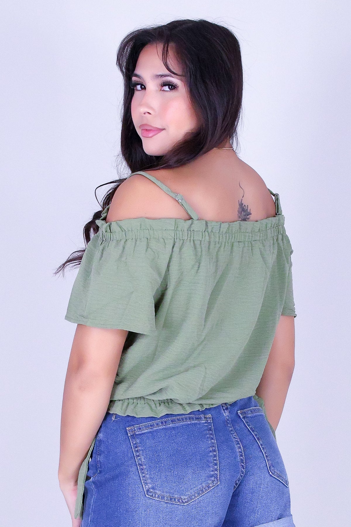 BREEZY TIE TOP is available in color OLIVE and in size SMALL, MED, LARGE.