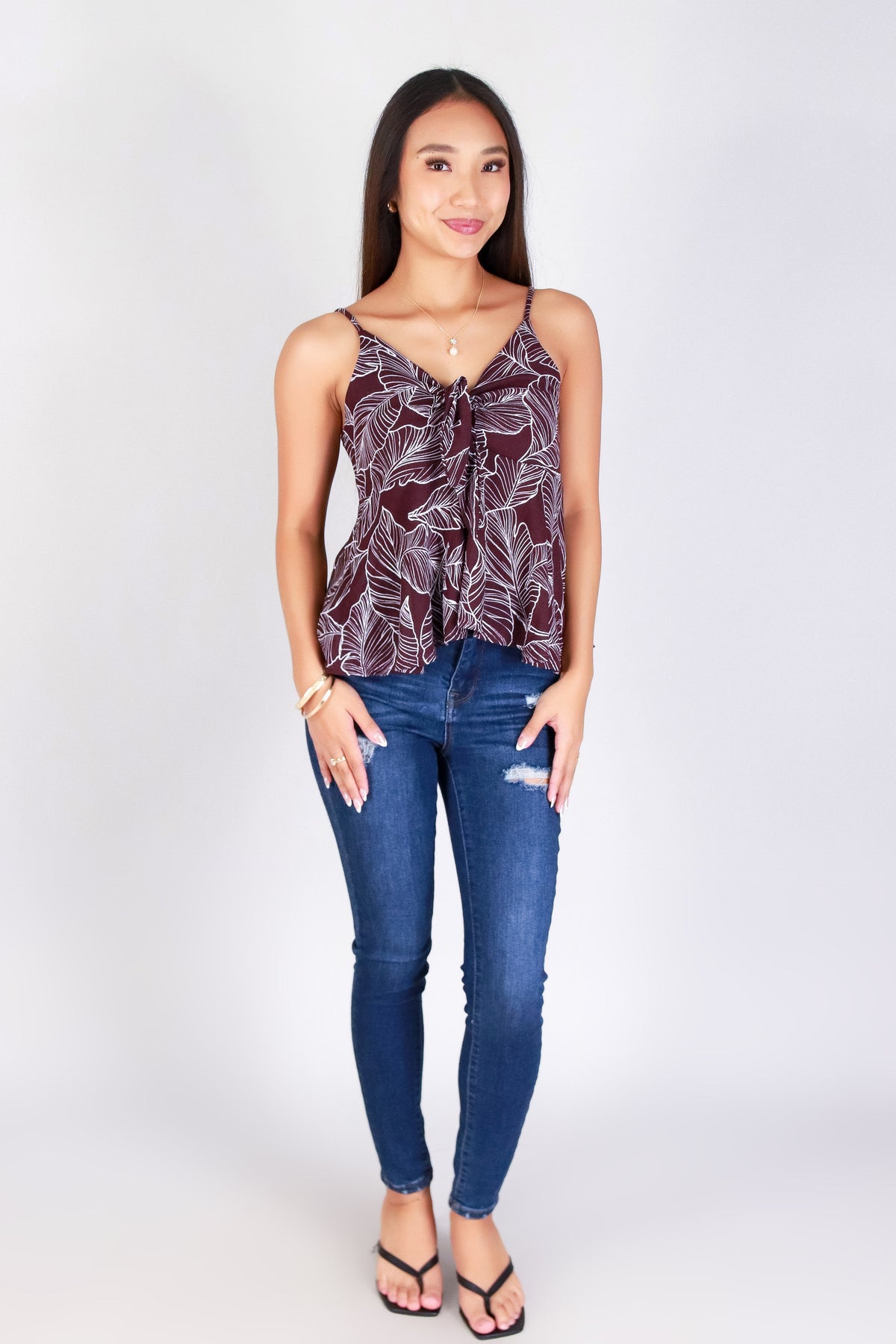 TROPICAL LEAF TIE FRONT TOP is available in color BROWN and in size SMALL, MED, LARGE.