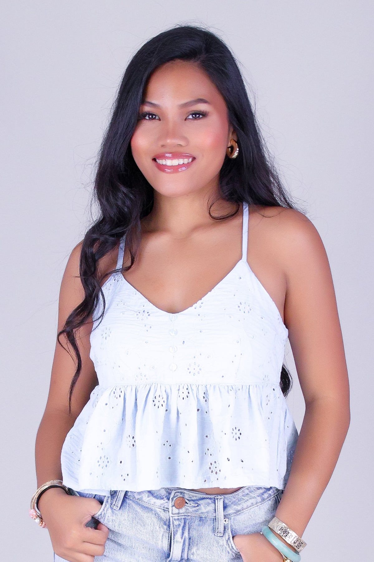 PRETTY IN LOVE TOP is available in color LIGHT BLUE and in size SMALL, MED, LARGE, XL.