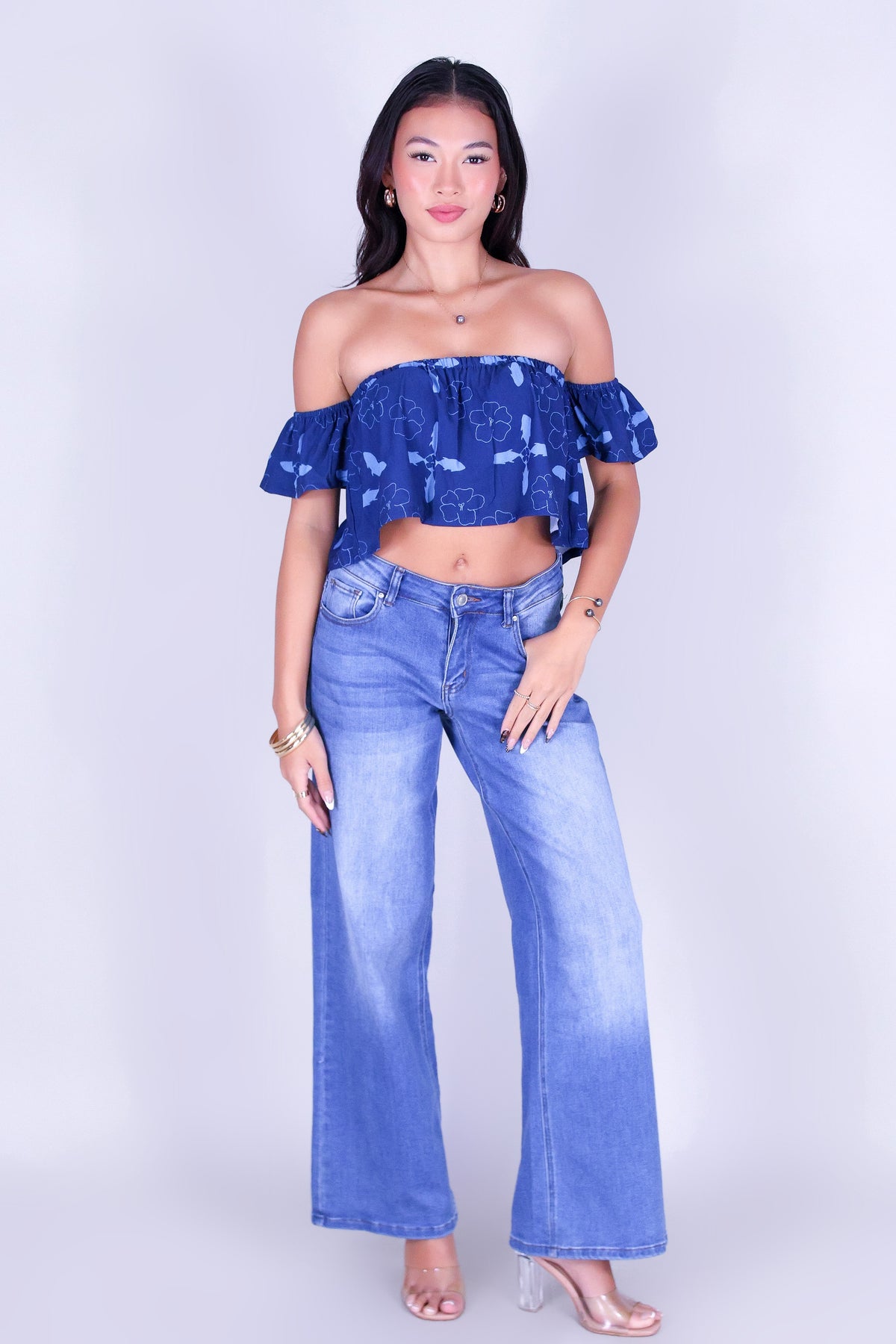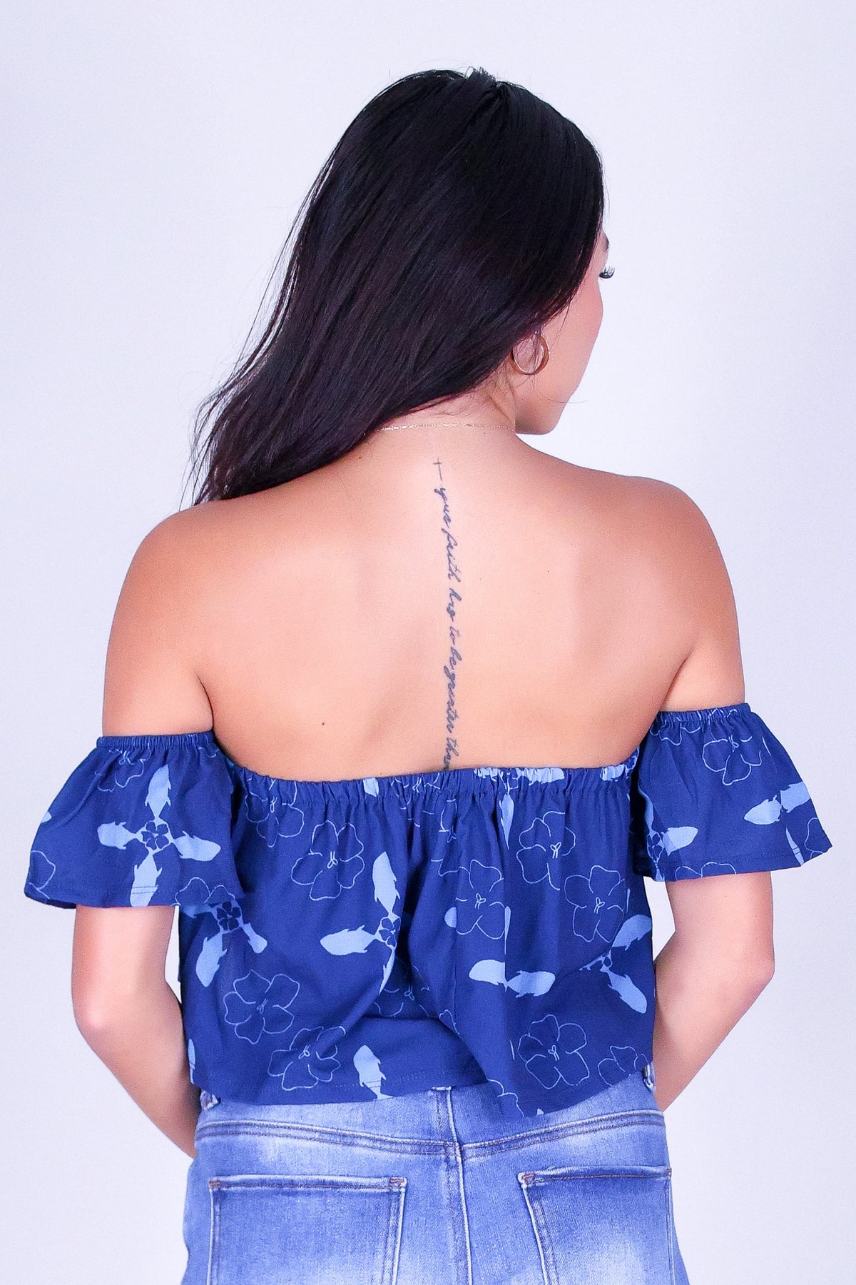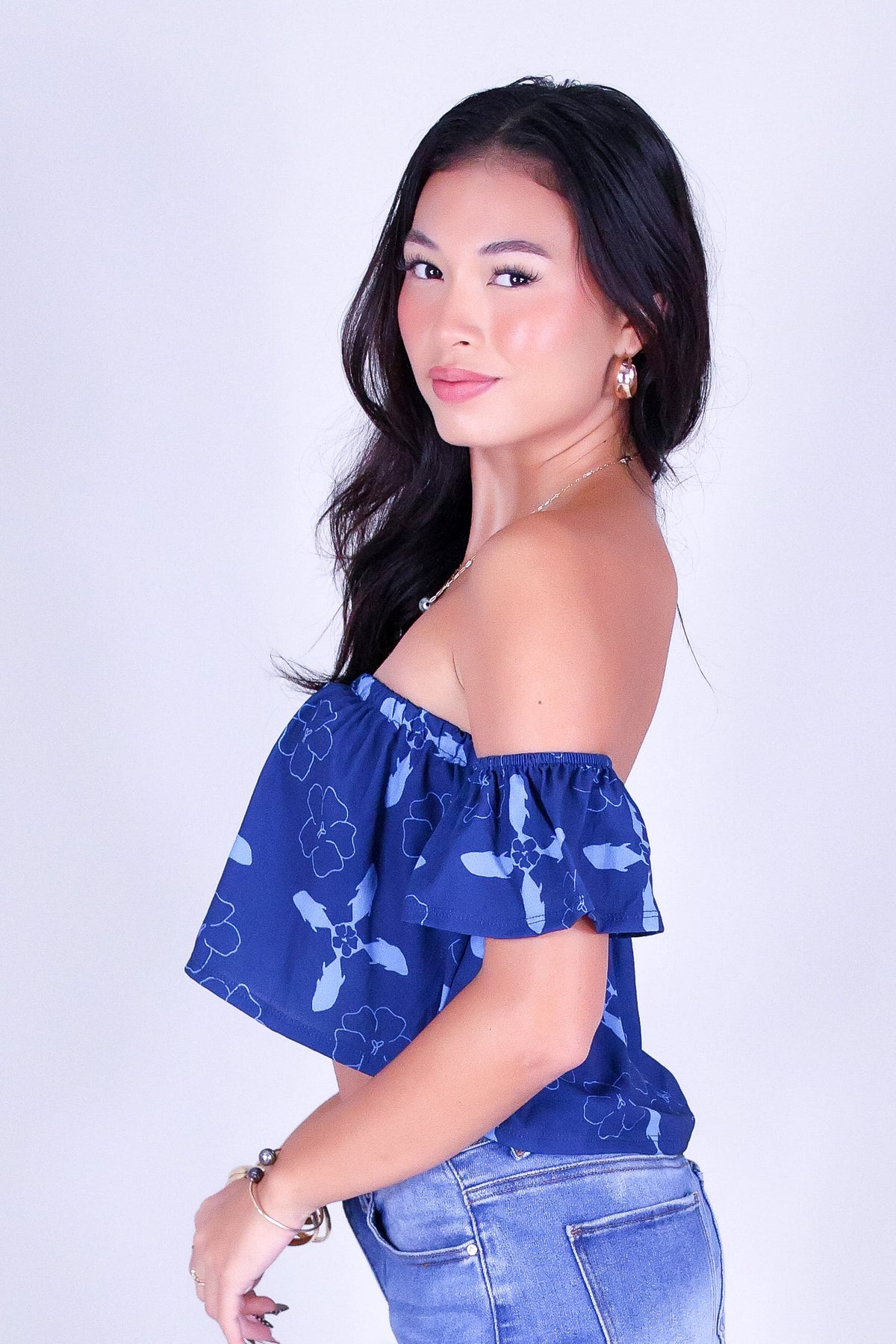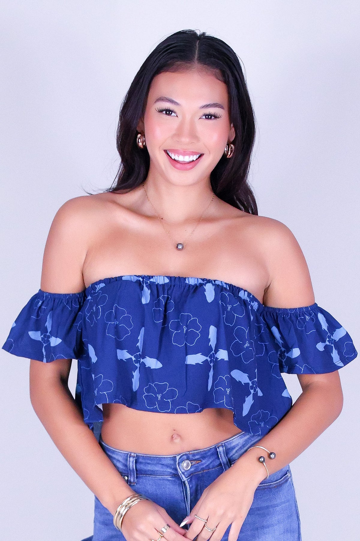 ULUA QUILT OFF SHOULDER TOP is available in color NAVY and in size SMALL, MED, LARGE.