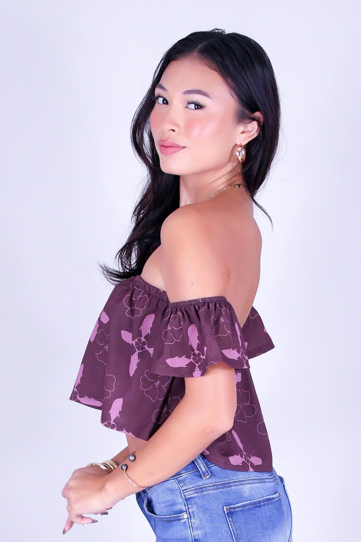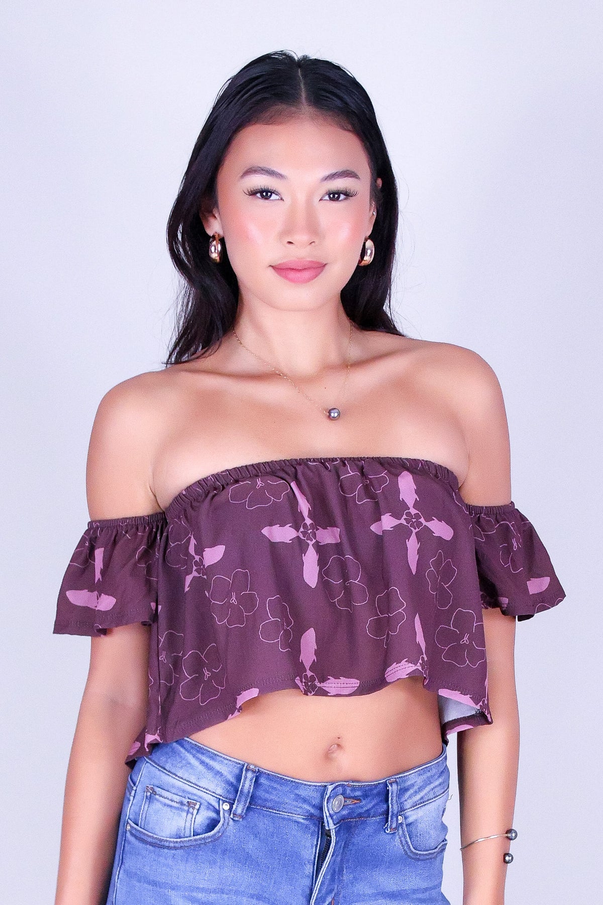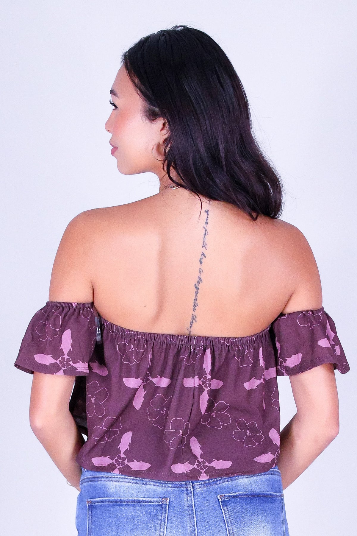 ULUA QUILT OFF SHOULDER TOP is available in color BERRY and in size SMALL, MED, LARGE.