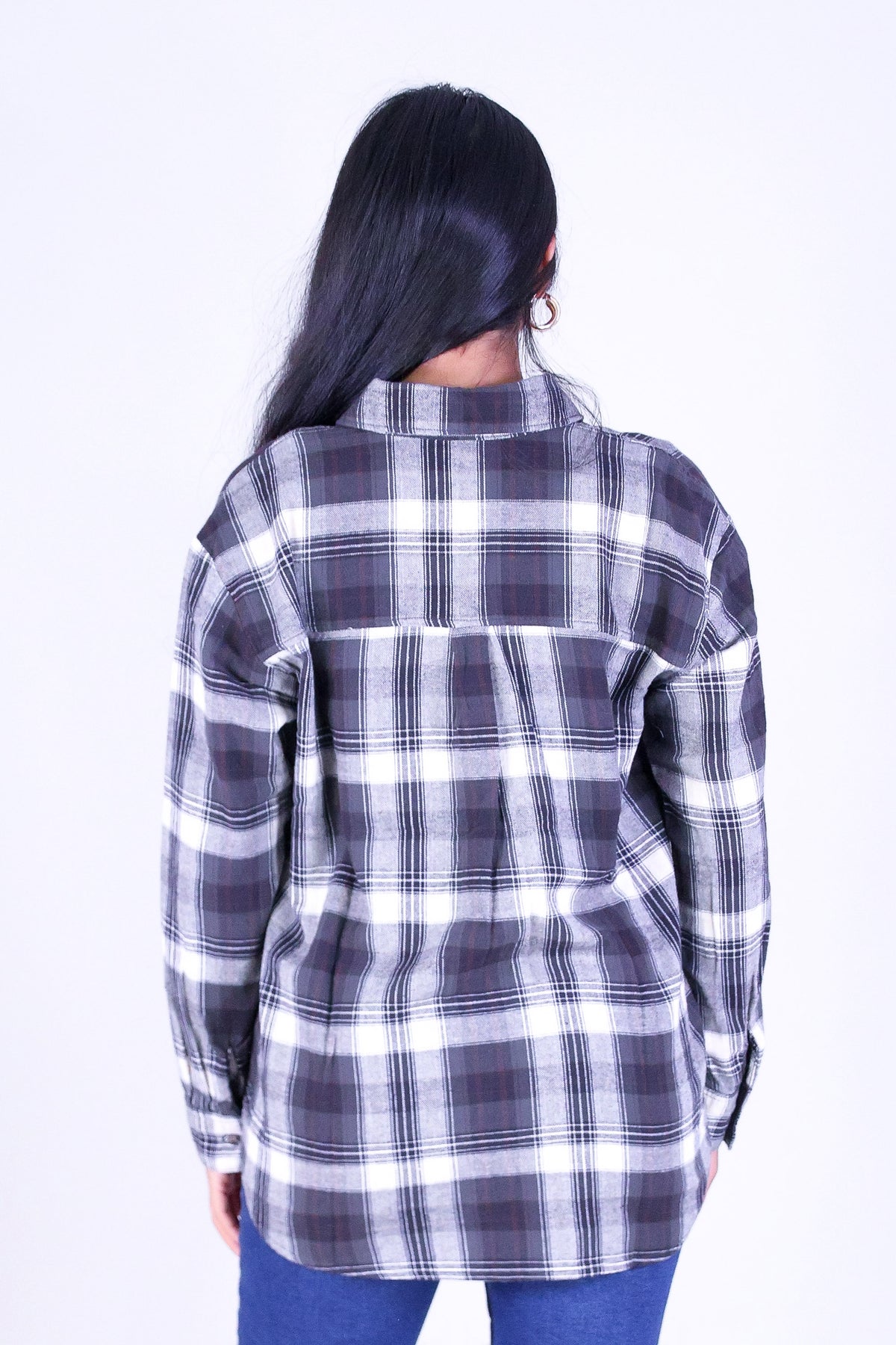 WARM CHECK OVERSIZED PLAID TOP is available in color KHAKI and in size s/m, m/l.
