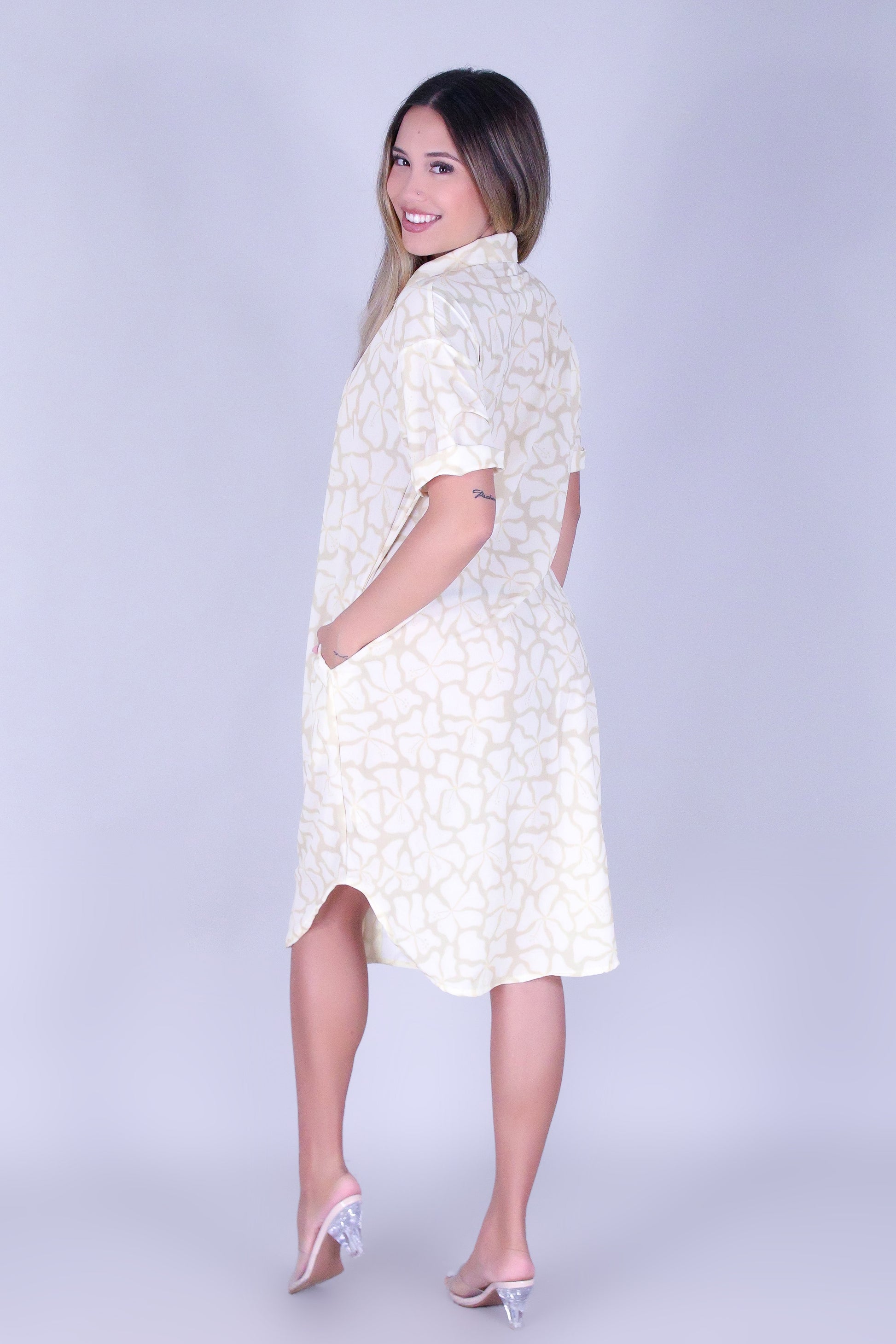 WAVY HIBISCUS BUTTON DOWN DRESS is available in color CREAM and in size SMALL, MED, LARGE, XL.