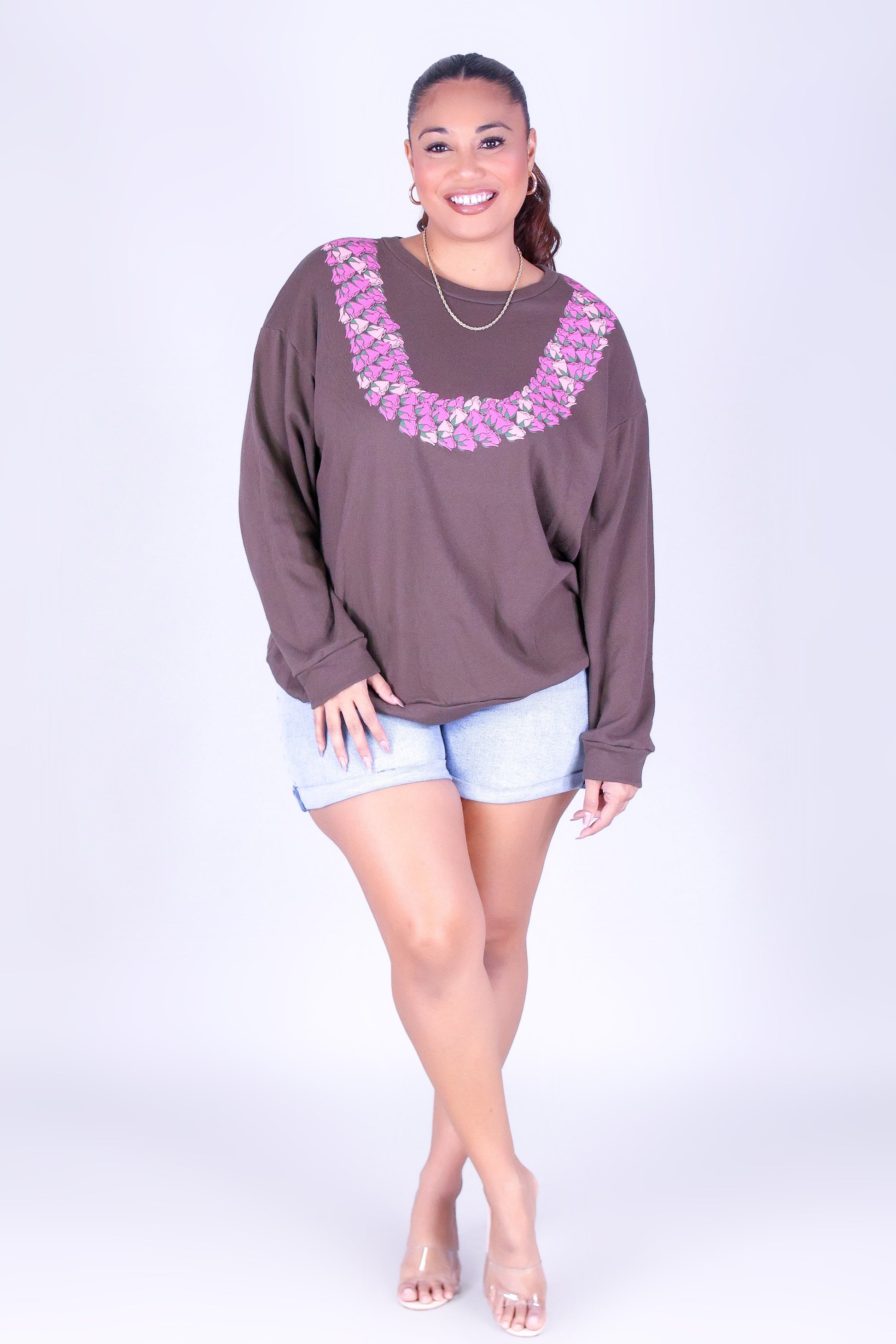 CLUSTERED LOKELANI SWEATER is available in color BROWN and in size 1X, 2X, 3X.