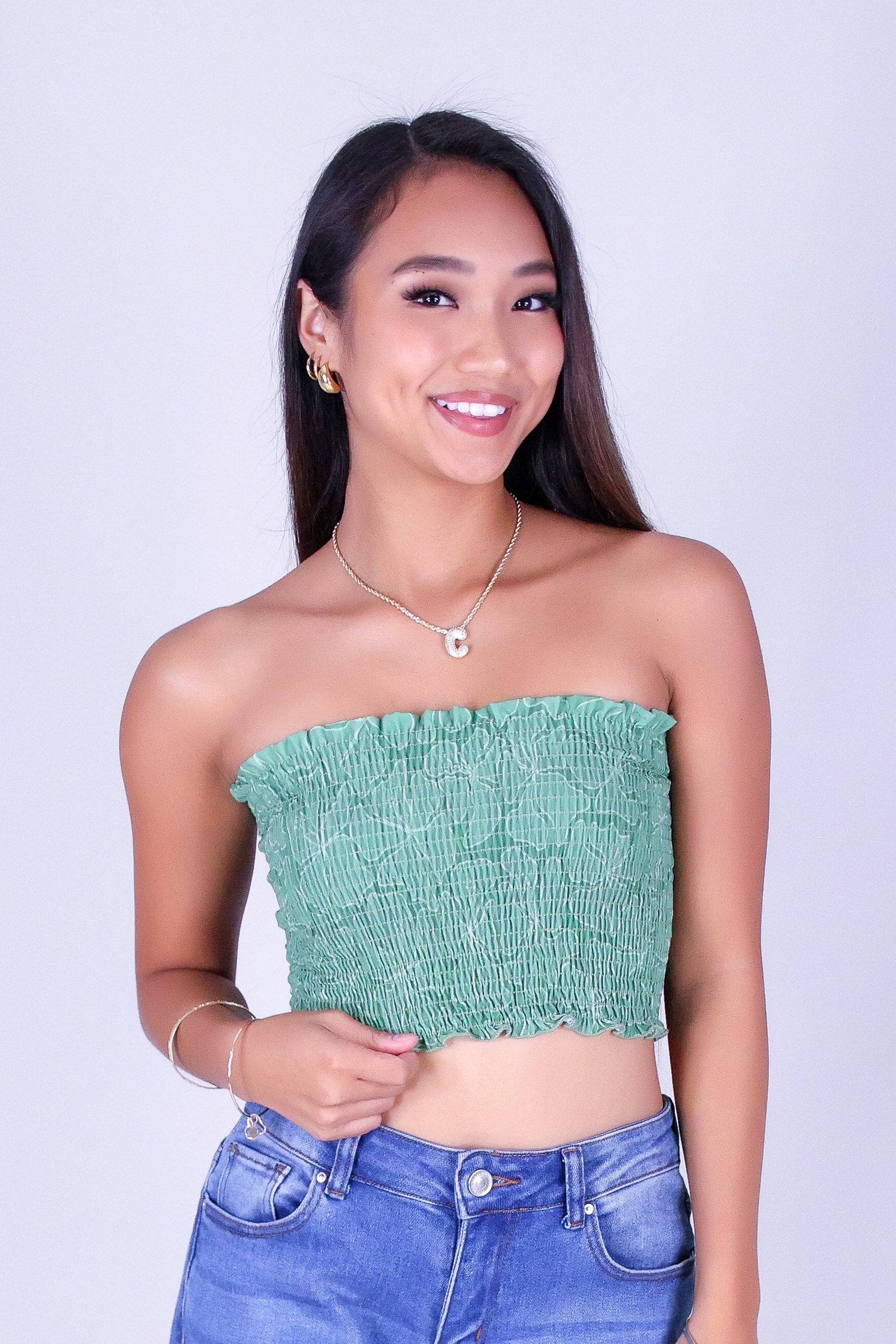 WAVY HIBISCUS SMOCKED CROP TUBE TOP is available in color SAGE and in size SMALL, MED, LARGE.