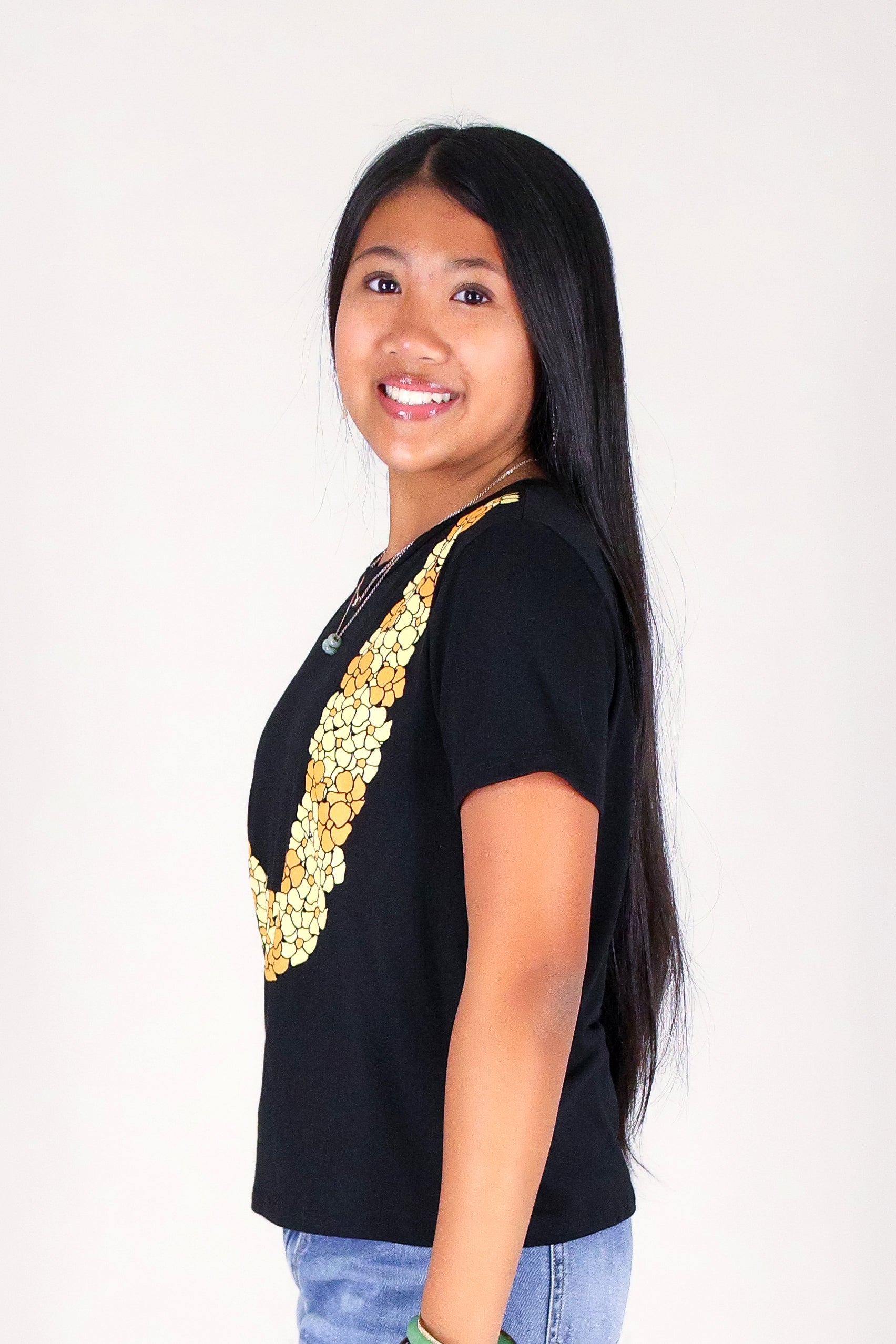 CLUSTERED PUAKENIKENI LEI TEE | KIDS SIZE 2-16 is available in color BLACK and in size 8, 10, 14, 16.