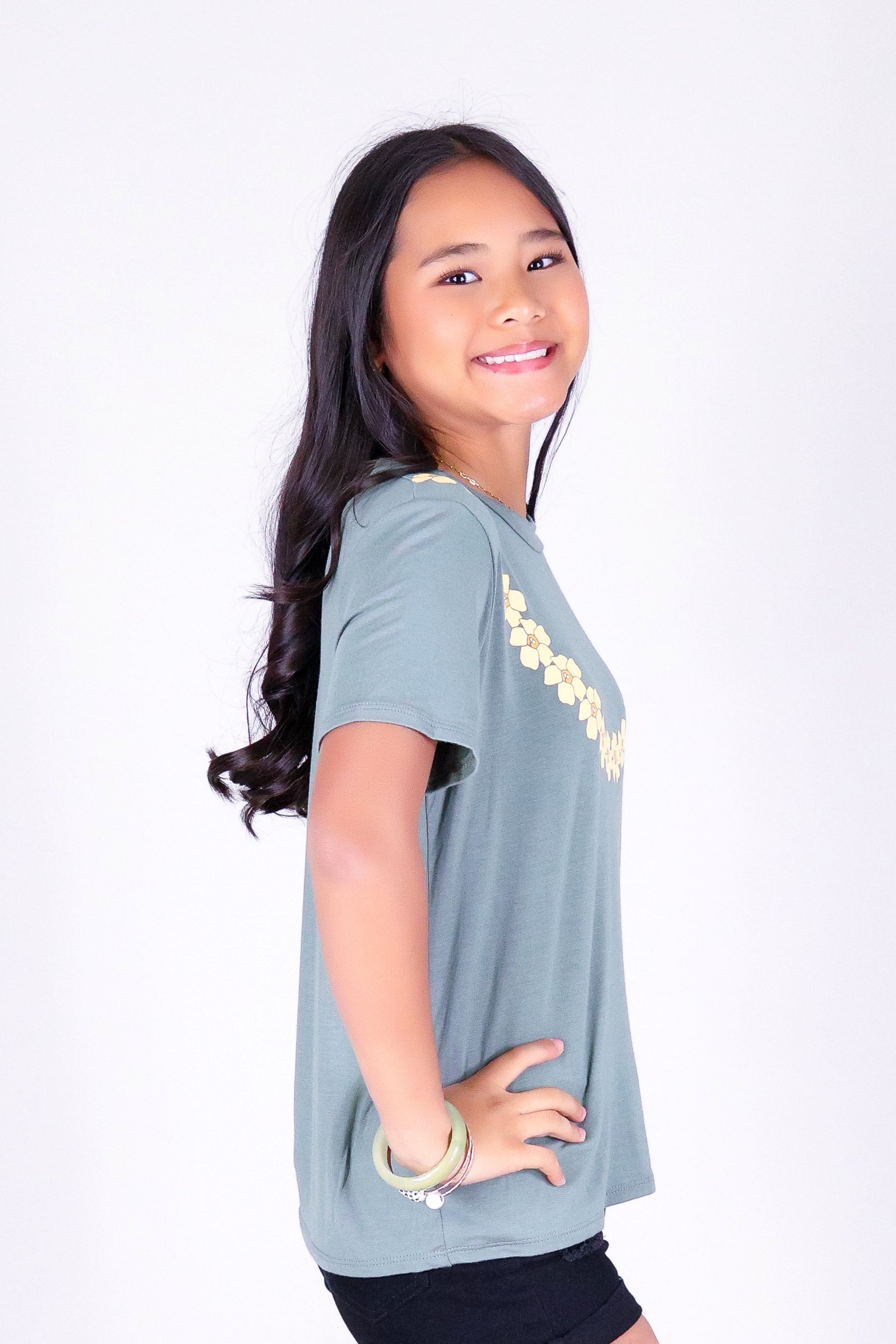PUAKENIKENI LEI TEE | KIDS SIZE 2-16 is available in color LT. OLIVE and in size 8, 10, 14, 16.