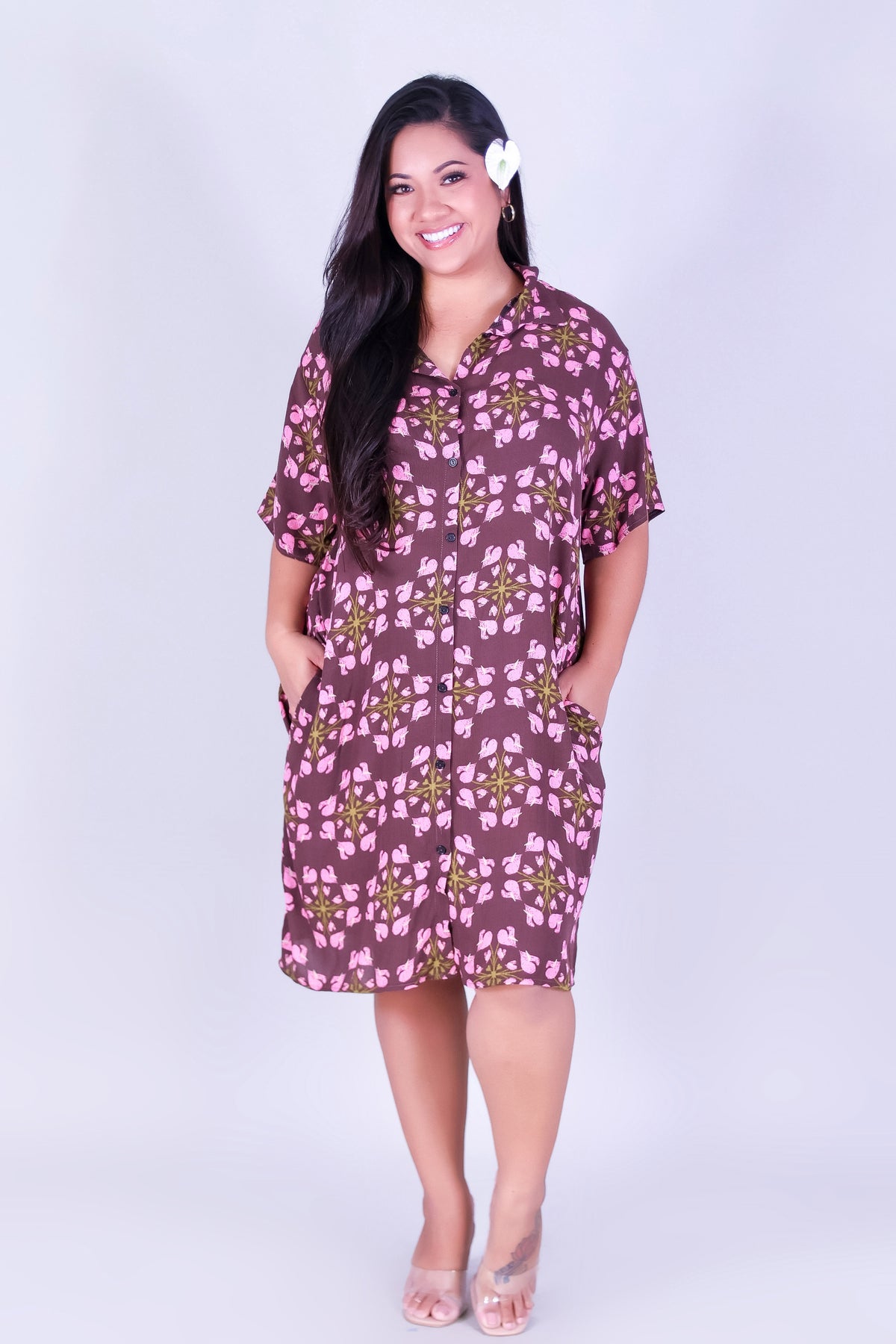 ANTHURIUM QUILT BUTTON DOWN DRESS is available in color BROWN and in size 1X, 2X, 3X.