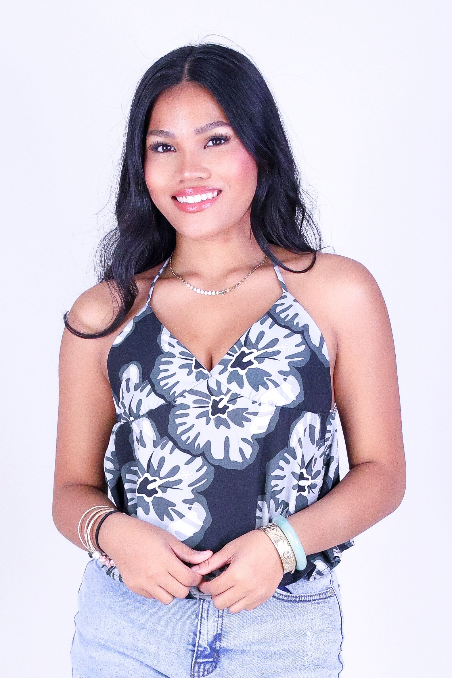 WATERCOLOR HIBISCUS HALTER TOP is available in color BLACK and in size SMALL, MED, LARGE.