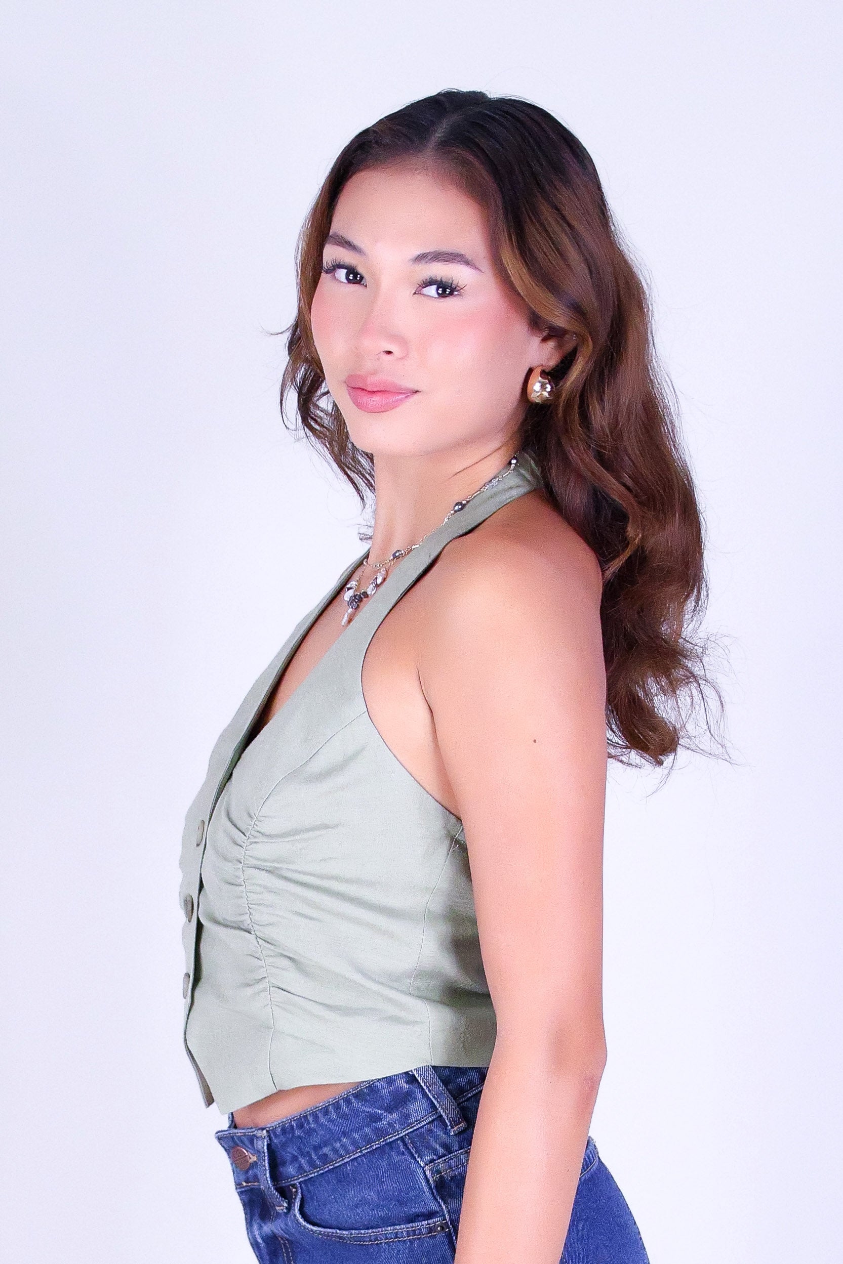 DESIRE HALTER VEST TOP is available in color OLIVE and in size SMALL, MED, LARGE.