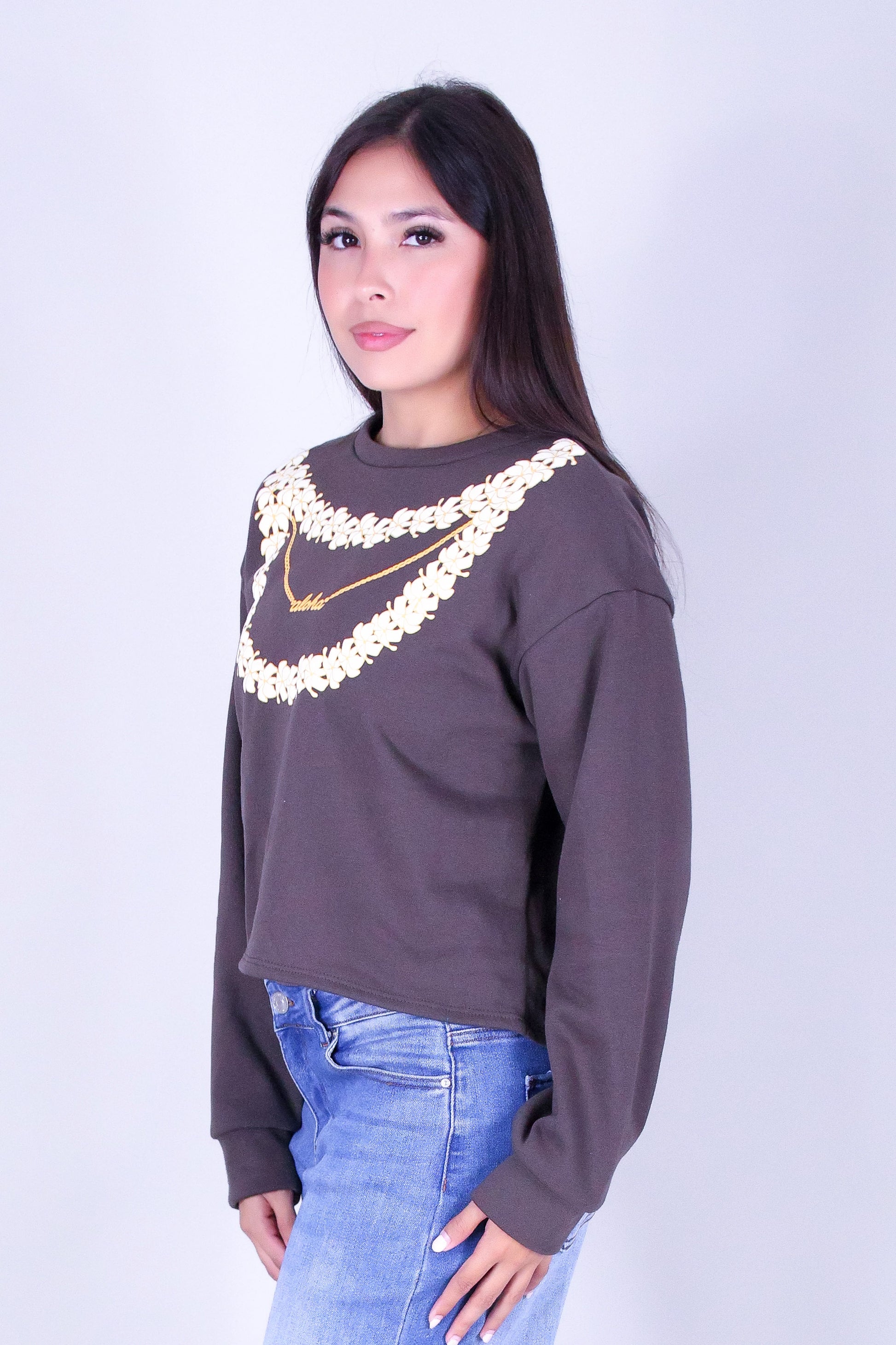 LAYERED PUAKENIKENI ALOHA SWEATER is available in color BROWN and in size SMALL, MED, LARGE.