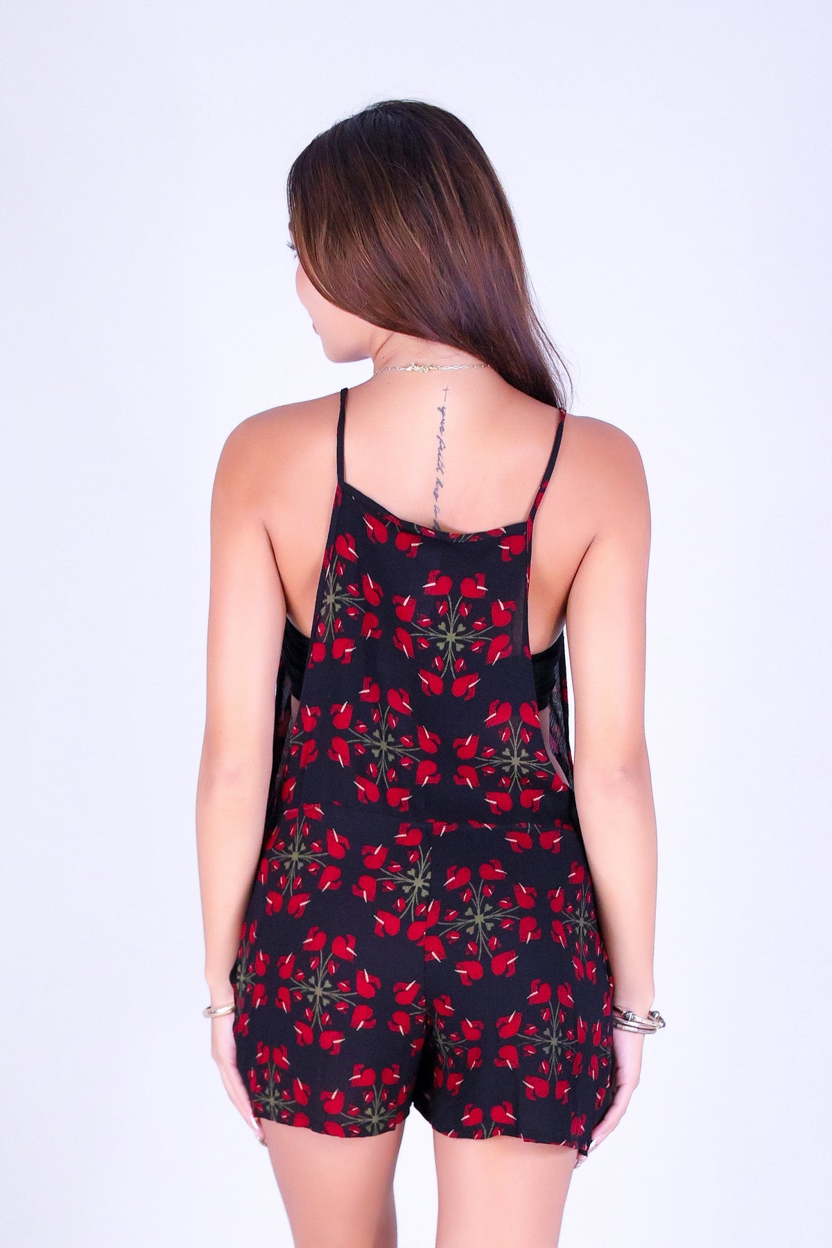 ANTHURIUM QUILT OVERALL ROMPER is available in color BLACK and in size SMALL, MED, LARGE, XL.