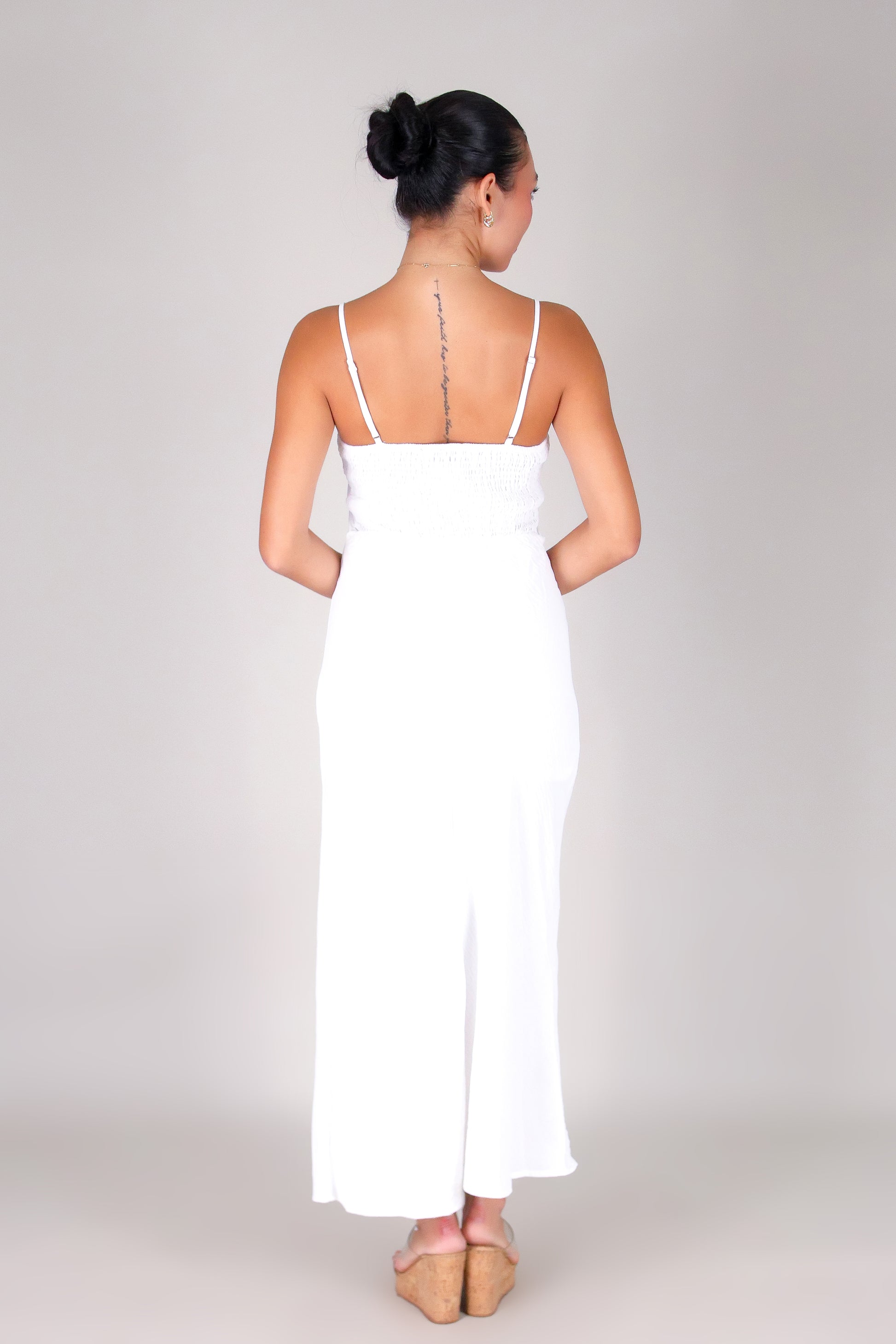 FIERCE IN FLOW MAXI DRESS is available in color WHITE and in size SMALL, MED, LARGE.