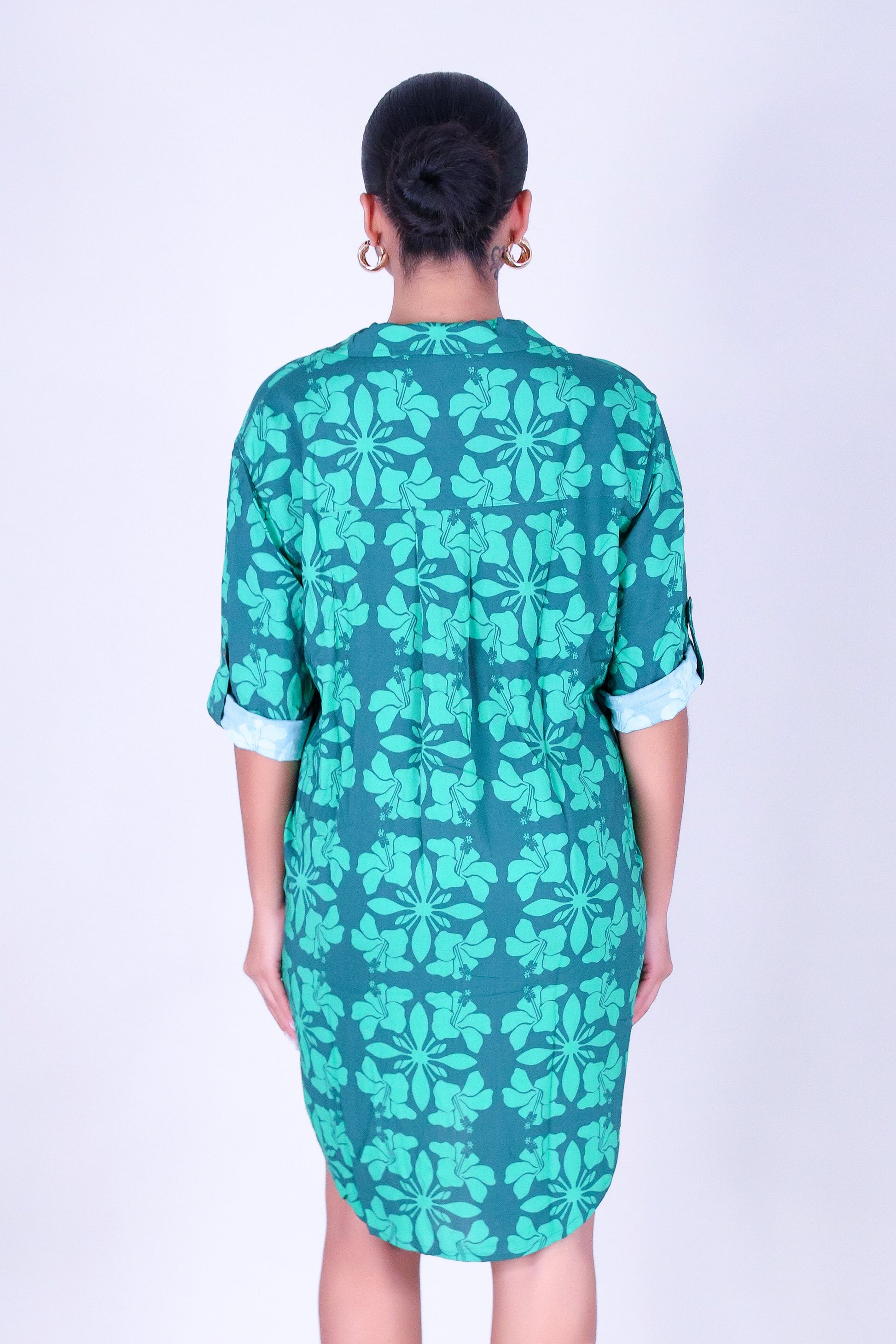 HIBISCUS QUILT BUTTON DOWN DRESS is available in color GREEN and in size SMALL, MED, LARGE.