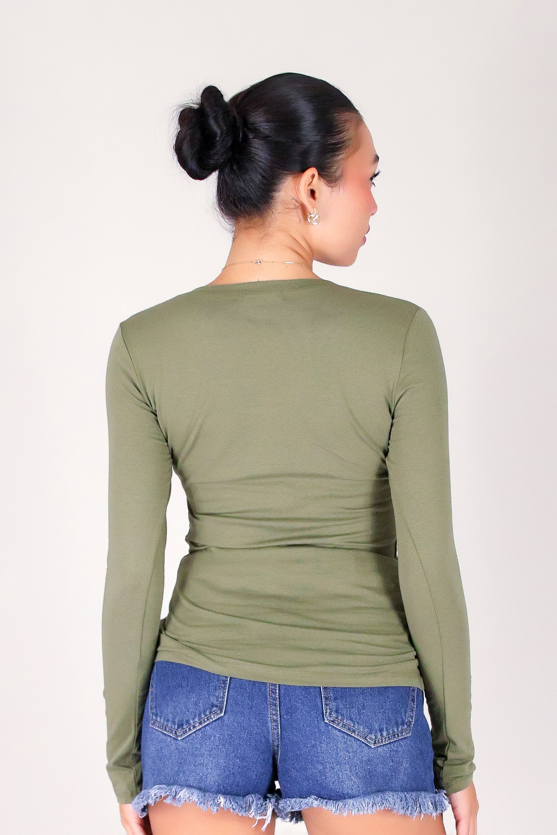 HOLD THAT THOUGHT LONG SLEEVE TOP is available in color OLIVE and in size SMALL, MED, LARGE.