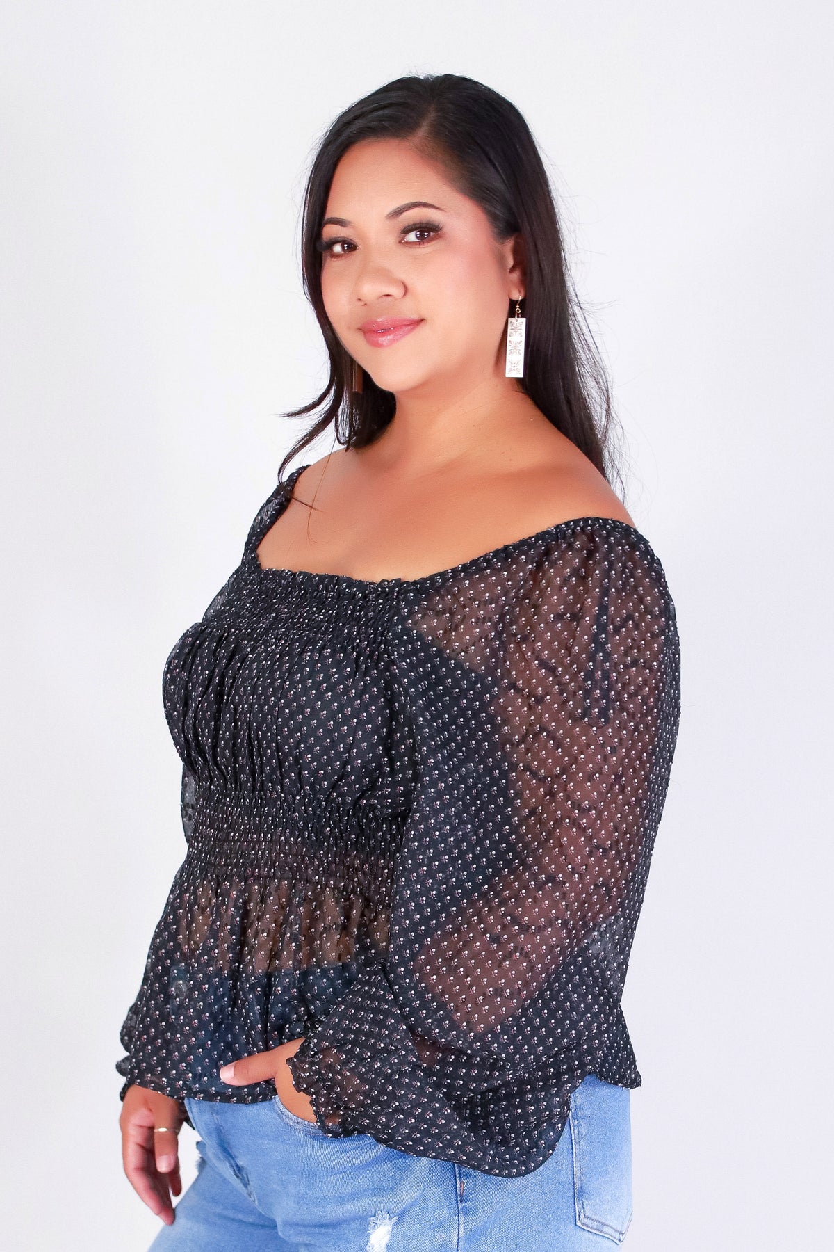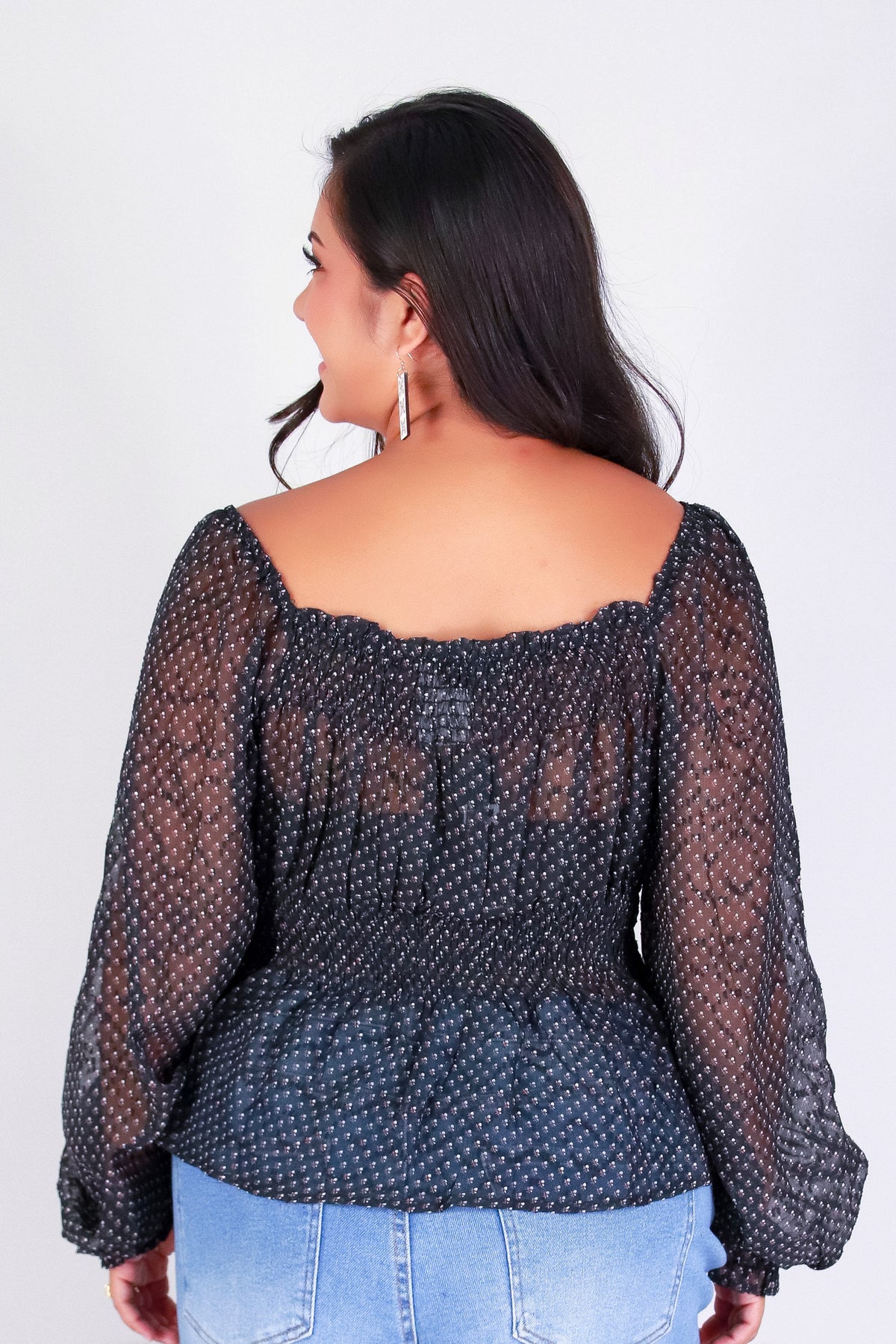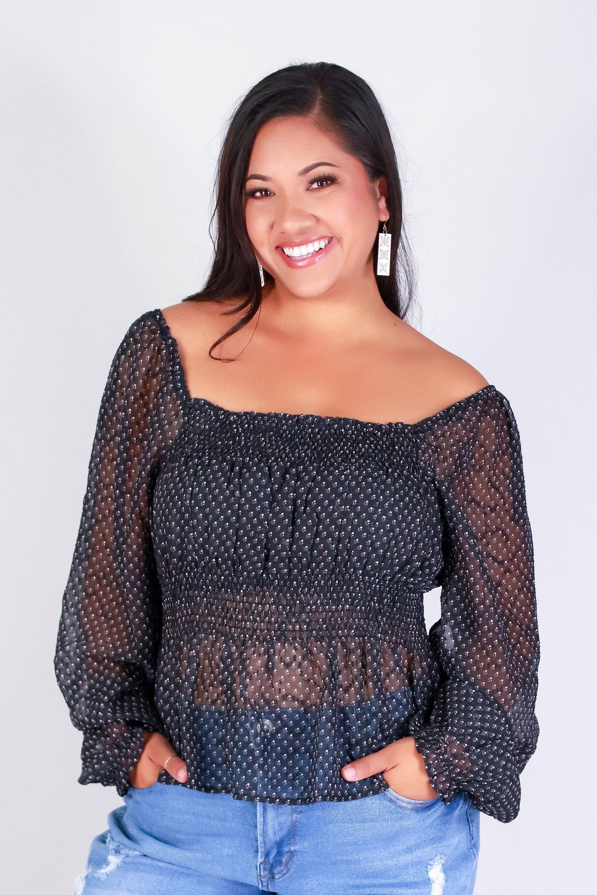 MEADOW MIST BABYDOLL TOP is available in color BLACK and in size 1X, 2X, 3X.