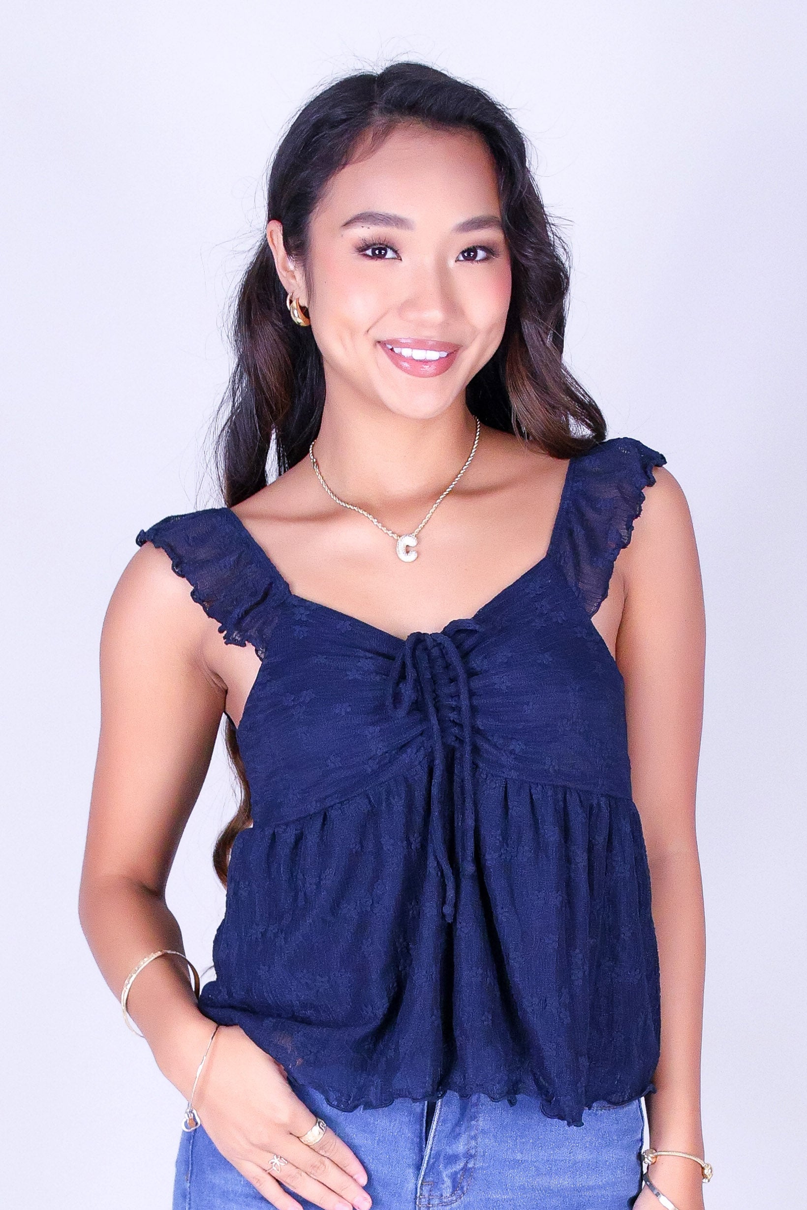 BEAUTIFUL LIFE BABYDOLL TOP is available in color NAVY and in size SMALL, MED, LARGE.