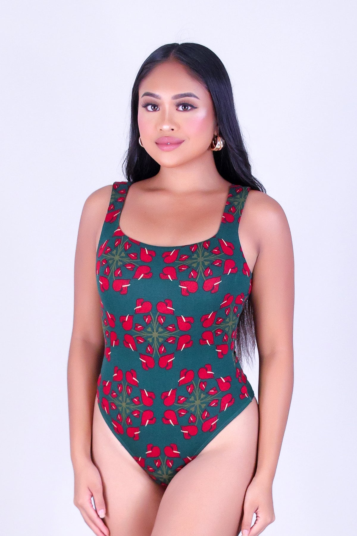 ANTHURIUM QUILT BODYSUIT is available in color DK.OLIVE and in size SMALL, MED, LARGE, XL.