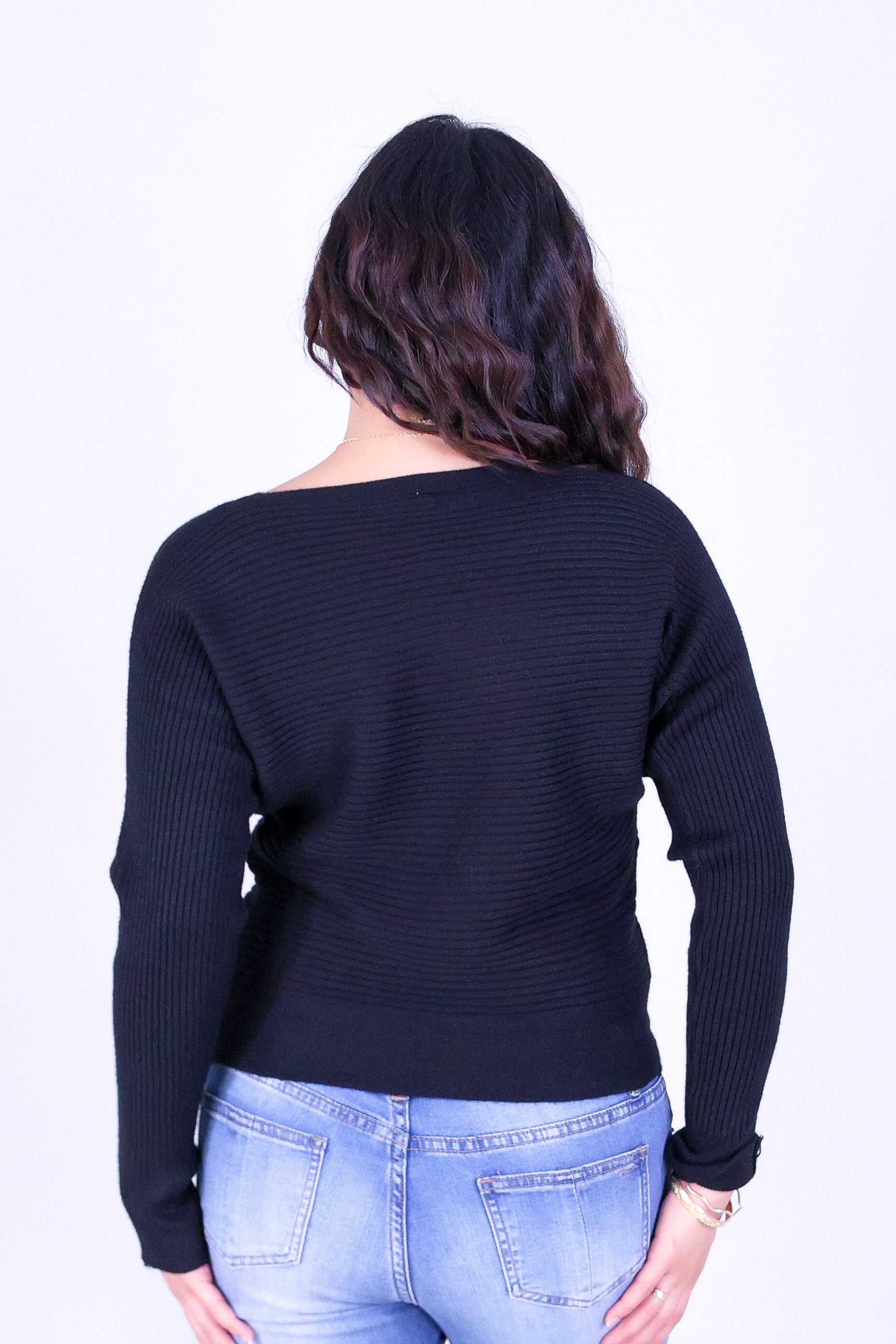 DREAMLINE SWEATER TOP is available in color BLACK and in size SMALL, MED, LARGE.