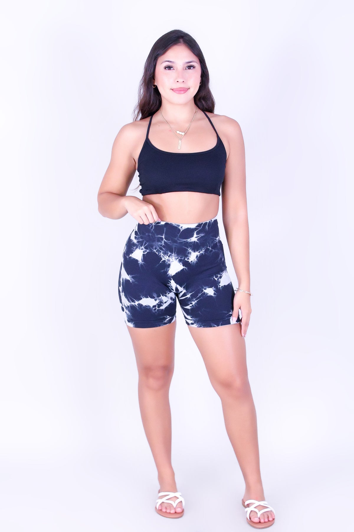 SNATCHED SEAMLESS TIE DYE BIKE SHORTS is available in color BLACK and in size SMALL, MED, LARGE, XL.