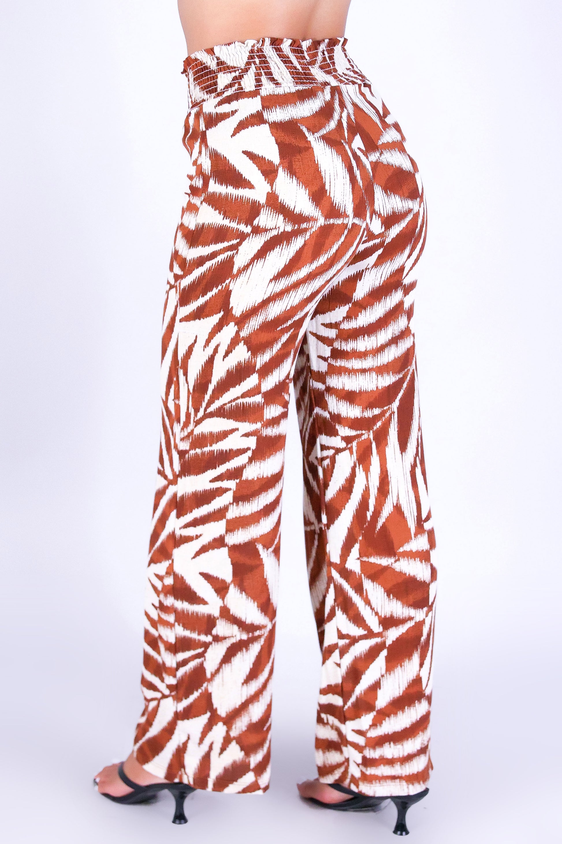 WATERCOLOR PARADISE SMOCKED WAIST PANTS is available in color BROWN and in size SMALL, MED, LARGE, XL.