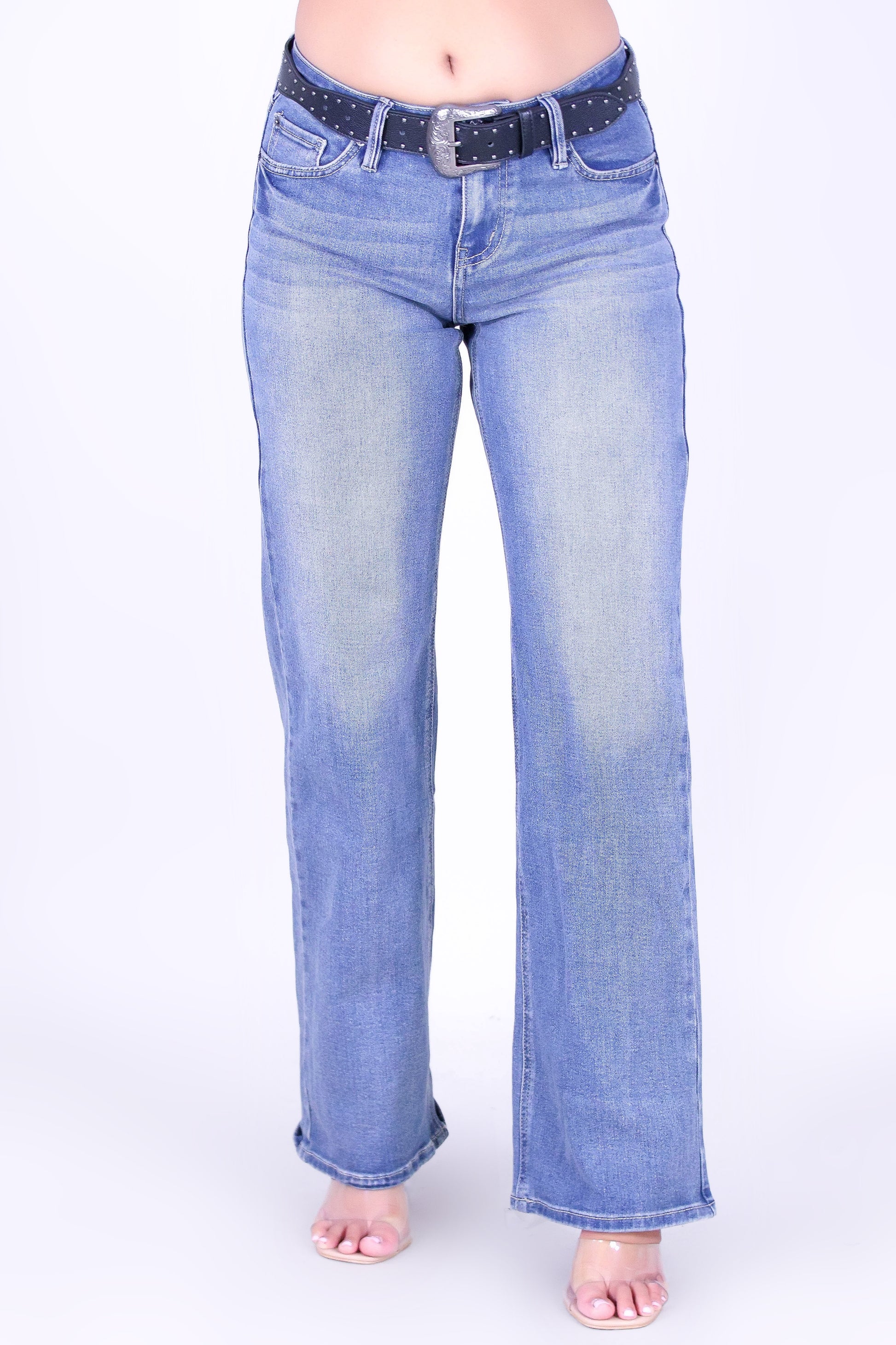BABY BLUE BELTED JEANS is available in color MED S/W and in size 1, 3, 5, 7, 9, 11, 13.