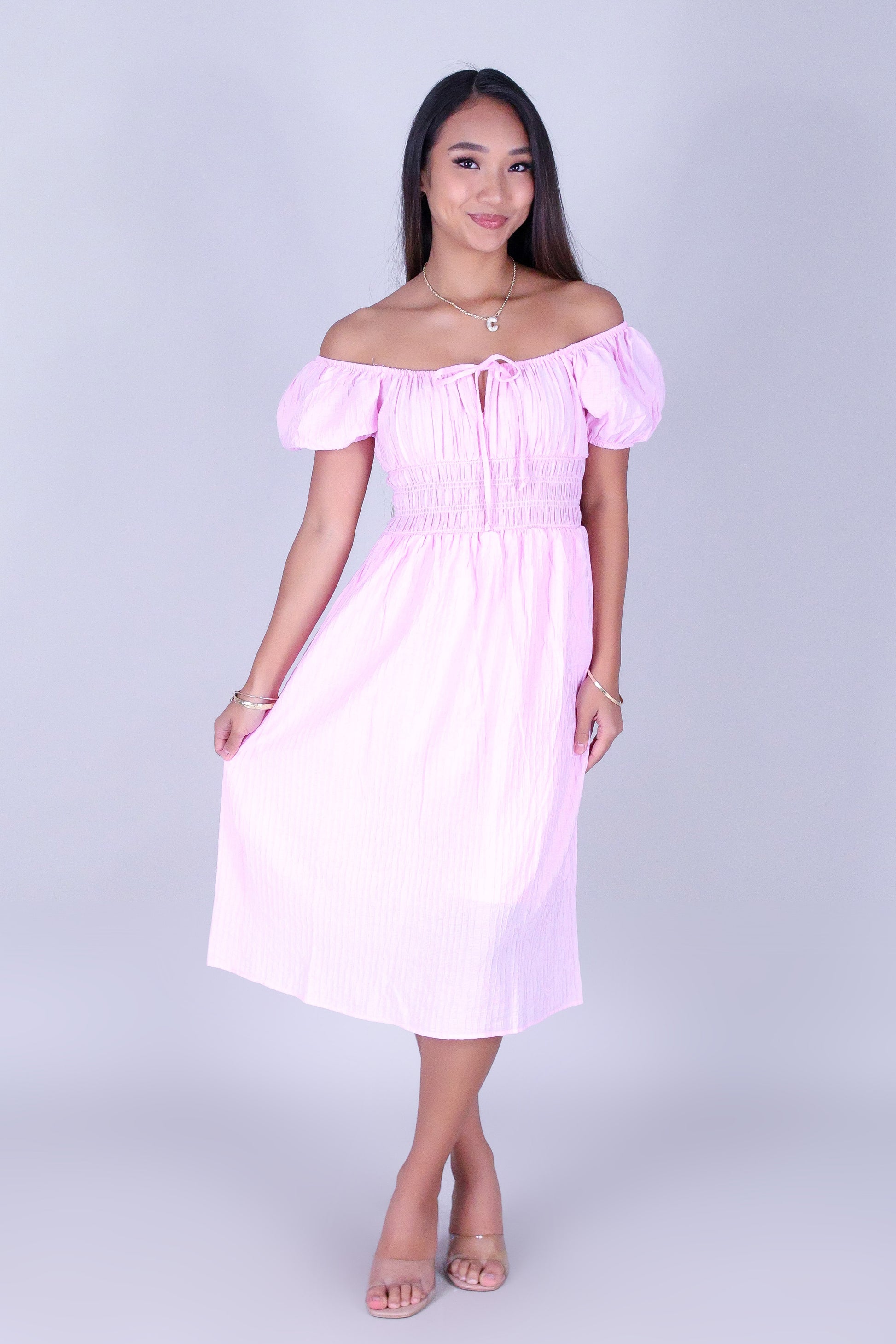 WILDFLOWER PUFF DRESS is available in color LT. PINK and in size SMALL, MED, LARGE.