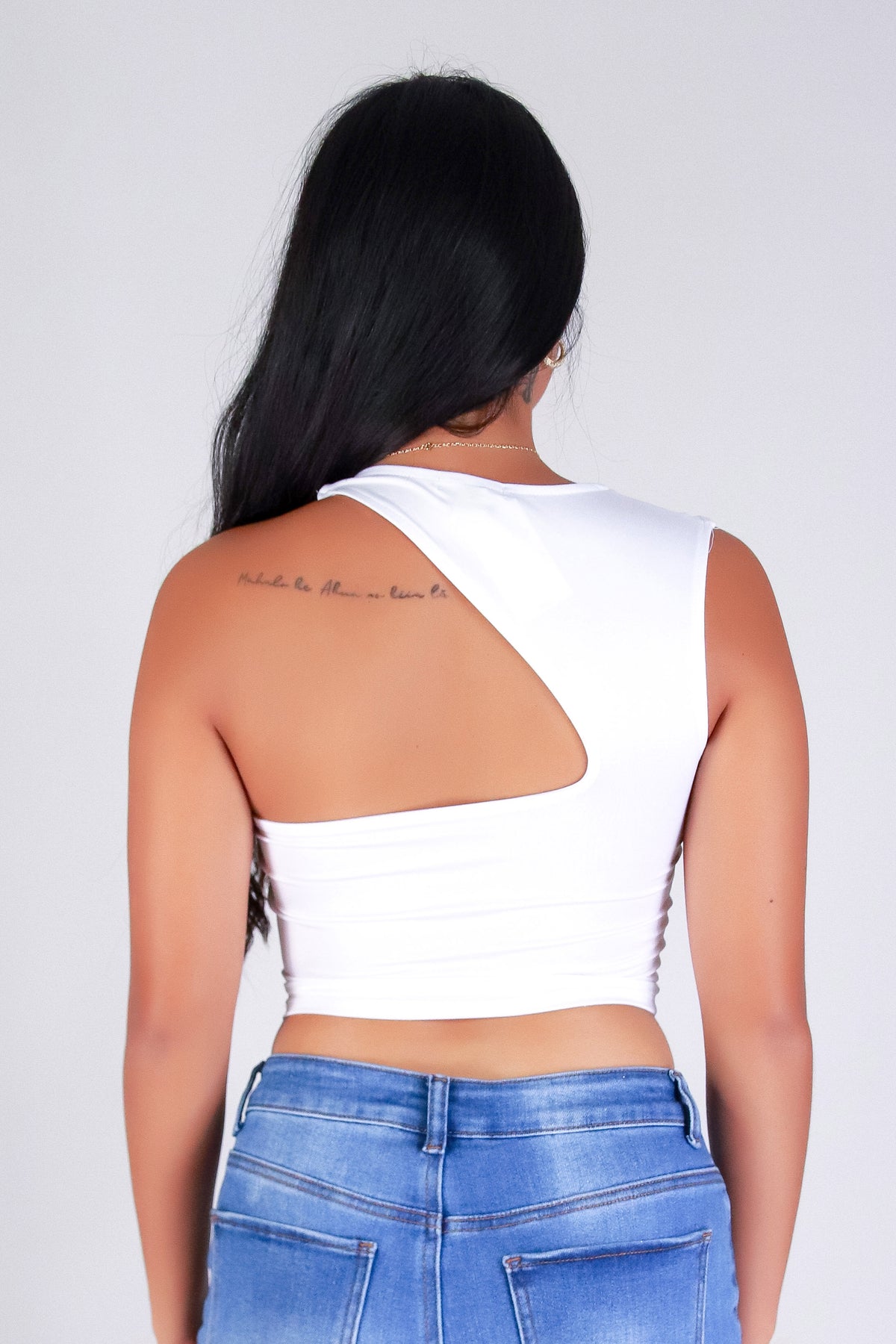 BACK IN STYLE CROP TOP is available in color WHITE and in size SMALL, MED, LARGE.