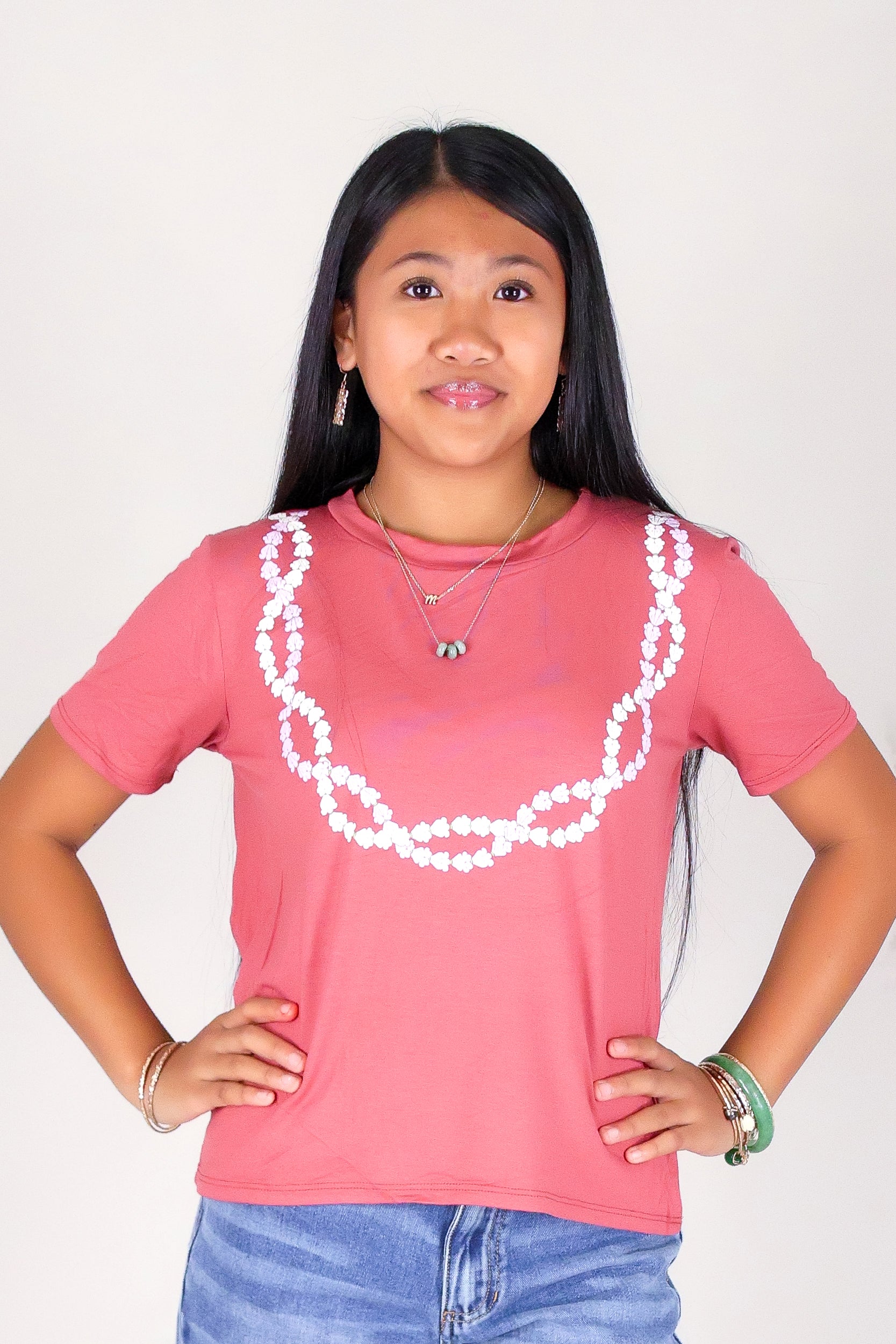 CROWN FLOWER TWIST LEI TEE | KIDS SIZE 2-16 is available in color COGNAC and in size 8, 10, 14, 16.