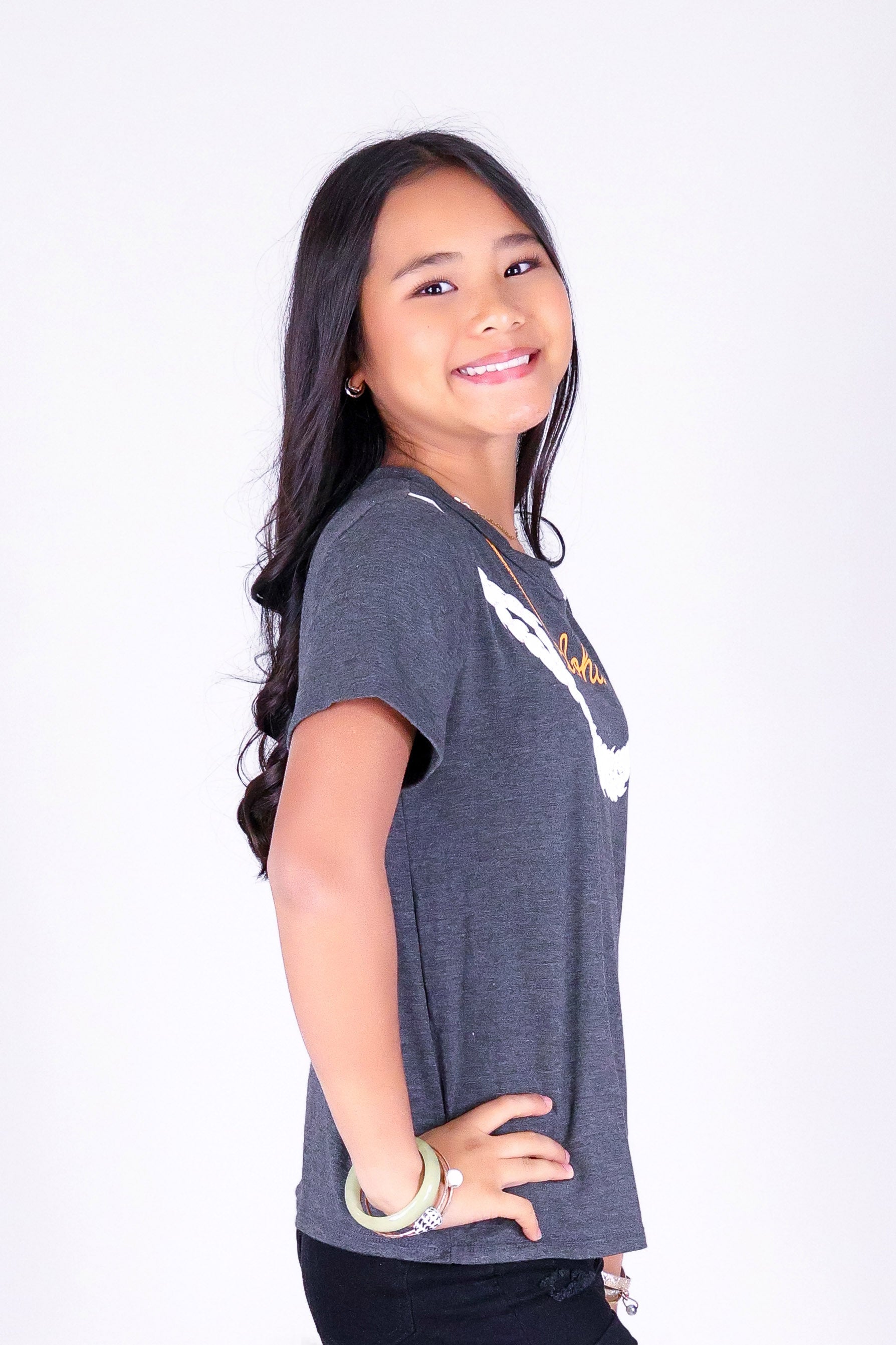 ALOHA PIKAKE NECKLACE LEI TEE | KIDS SIZE 2-16 is available in color CHARCOAL and in size 8, 10, 14, 16.