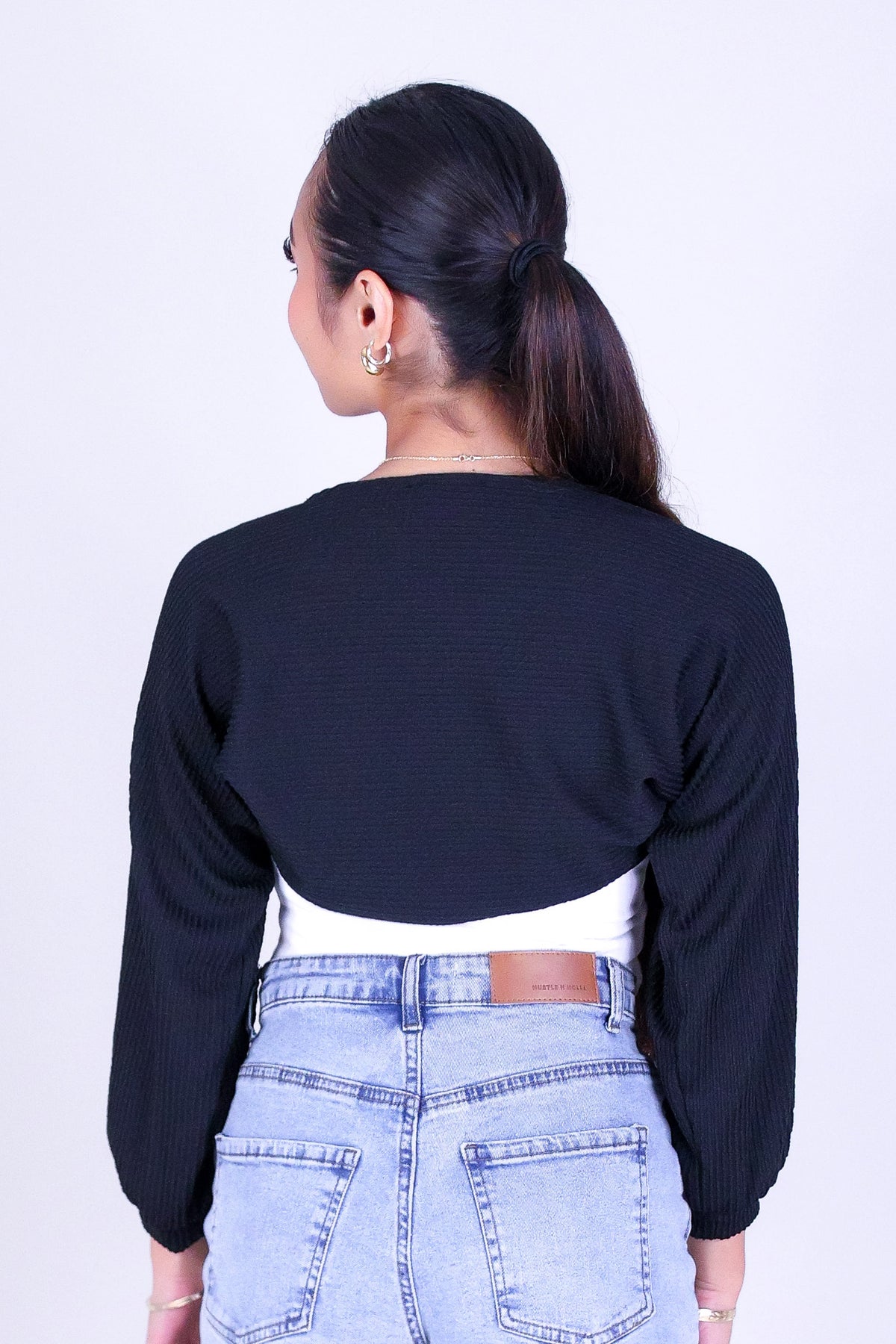 ALL ABOUT ME BOLERO TOP is available in color BLACK and in size SMALL, MED, LARGE.