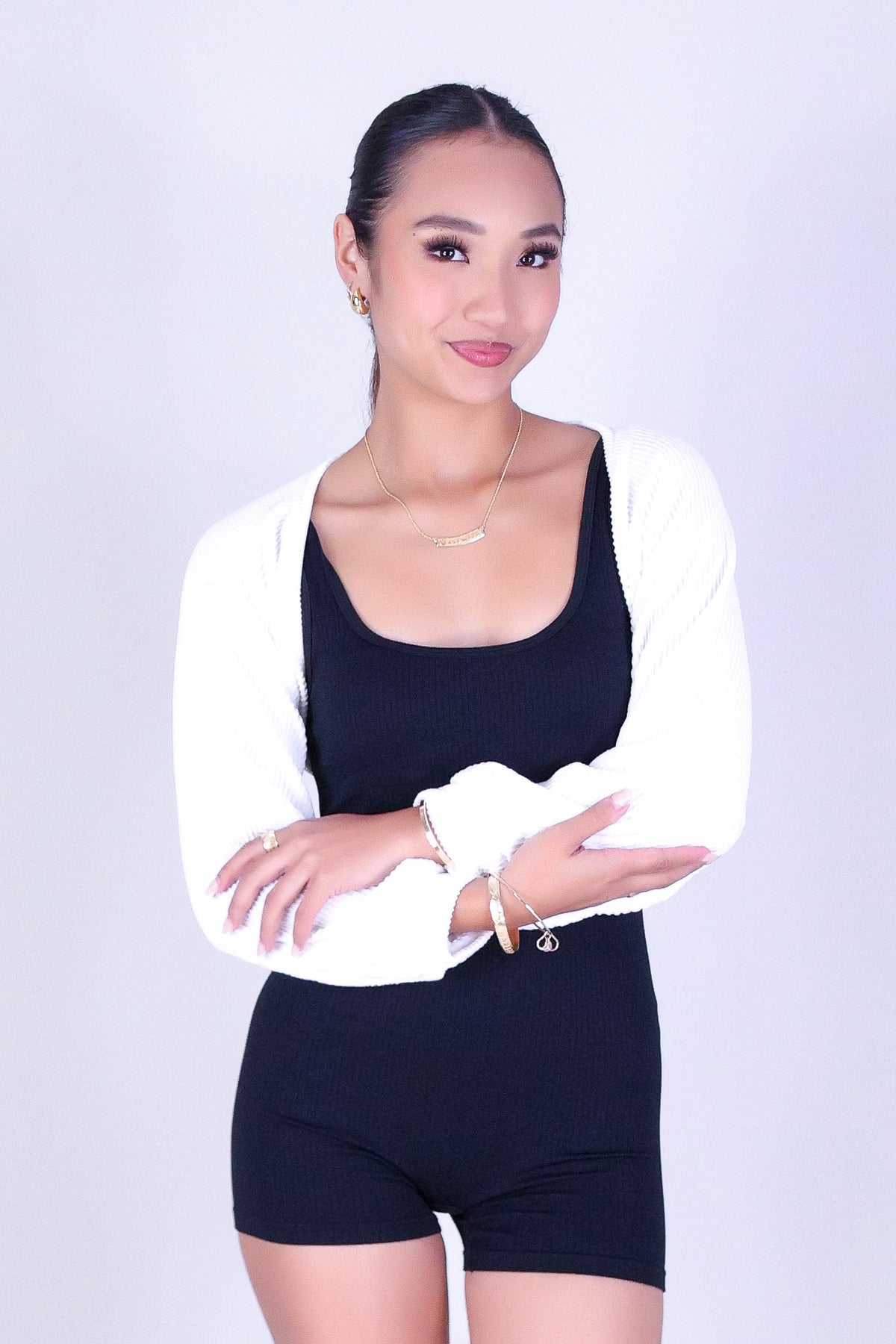 ALL ABOUT ME BOLERO TOP is available in color IVORY and in size SMALL, MED, LARGE.
