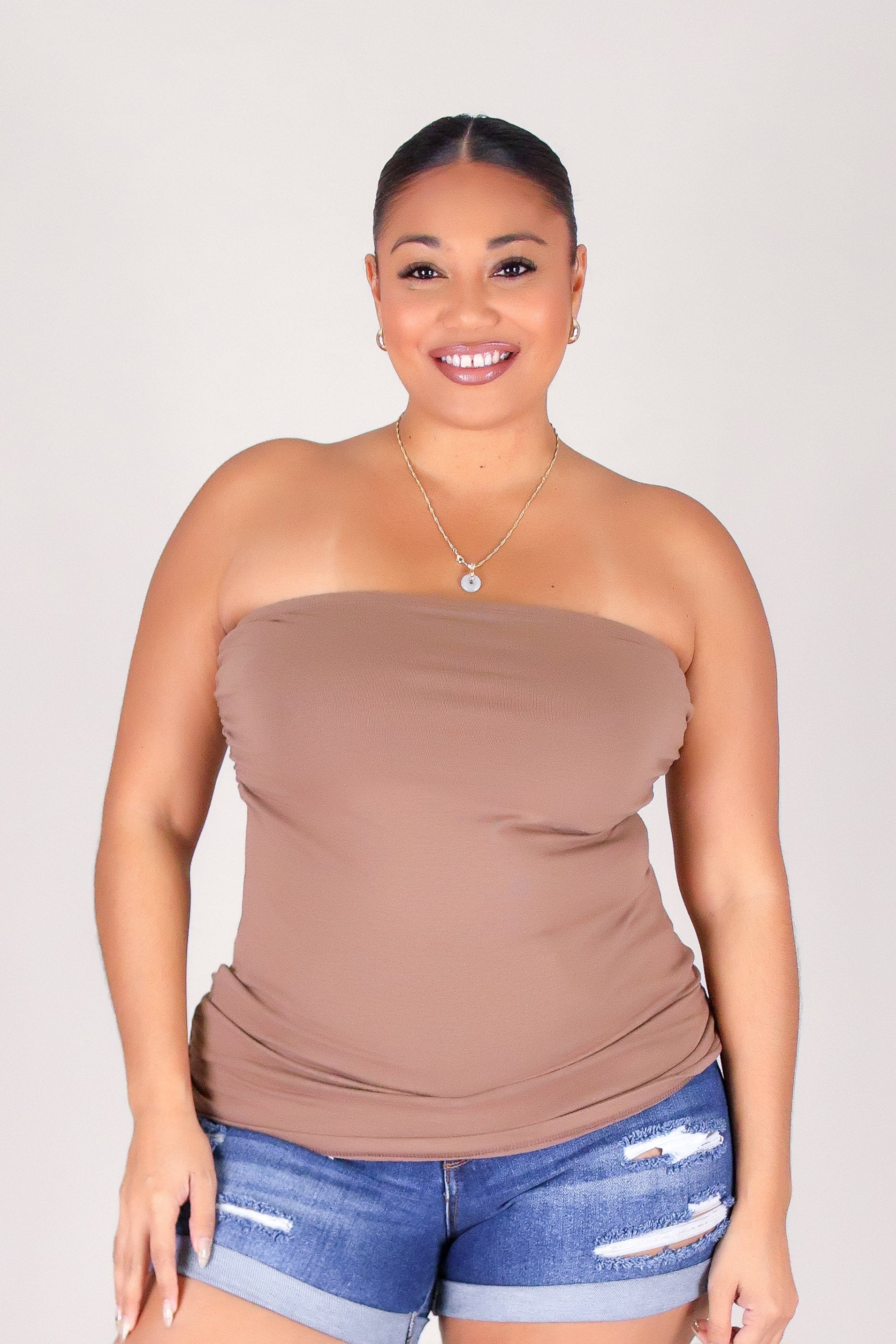 BOLD BASICS TUBE TOP is available in color DARK SAND and in size 1X, 2X, 3X.