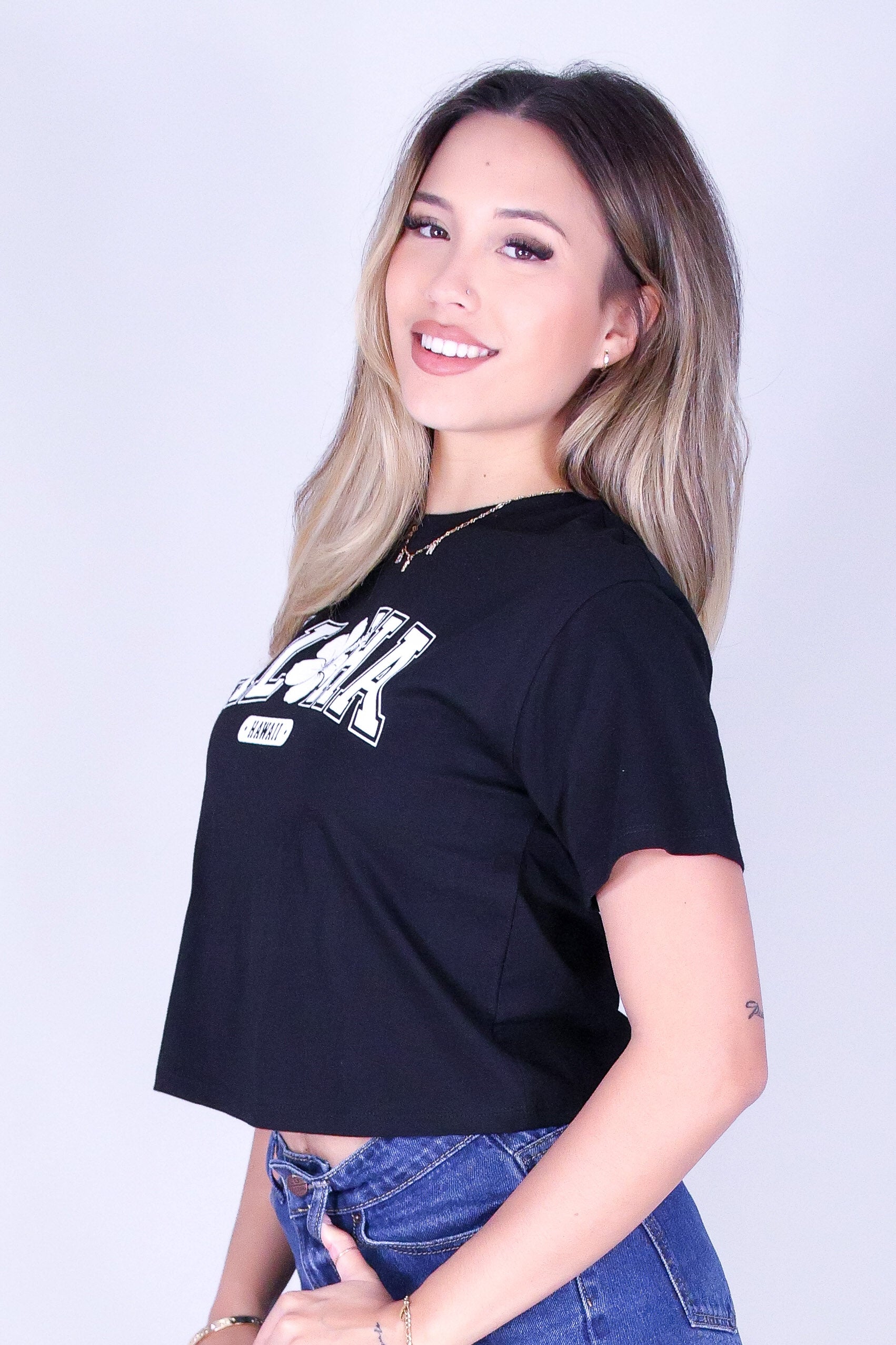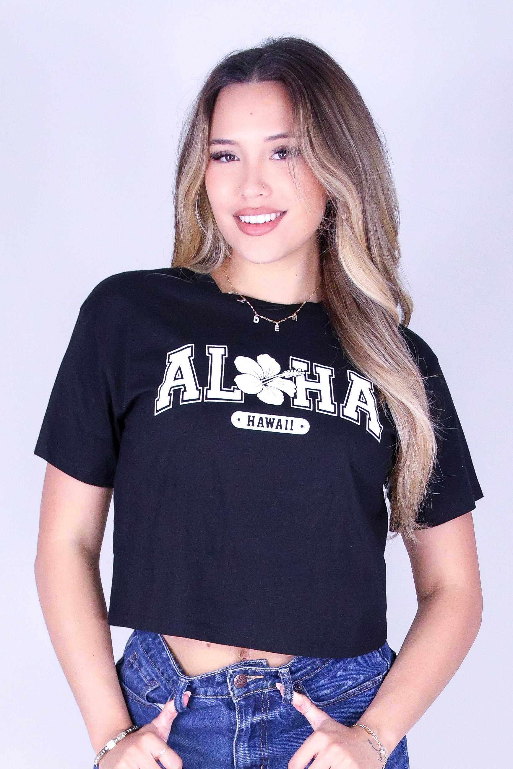 ALOHA HI CROP TEE is available in color BLACK and in size XS, SMALL, MED, LARGE, XL.