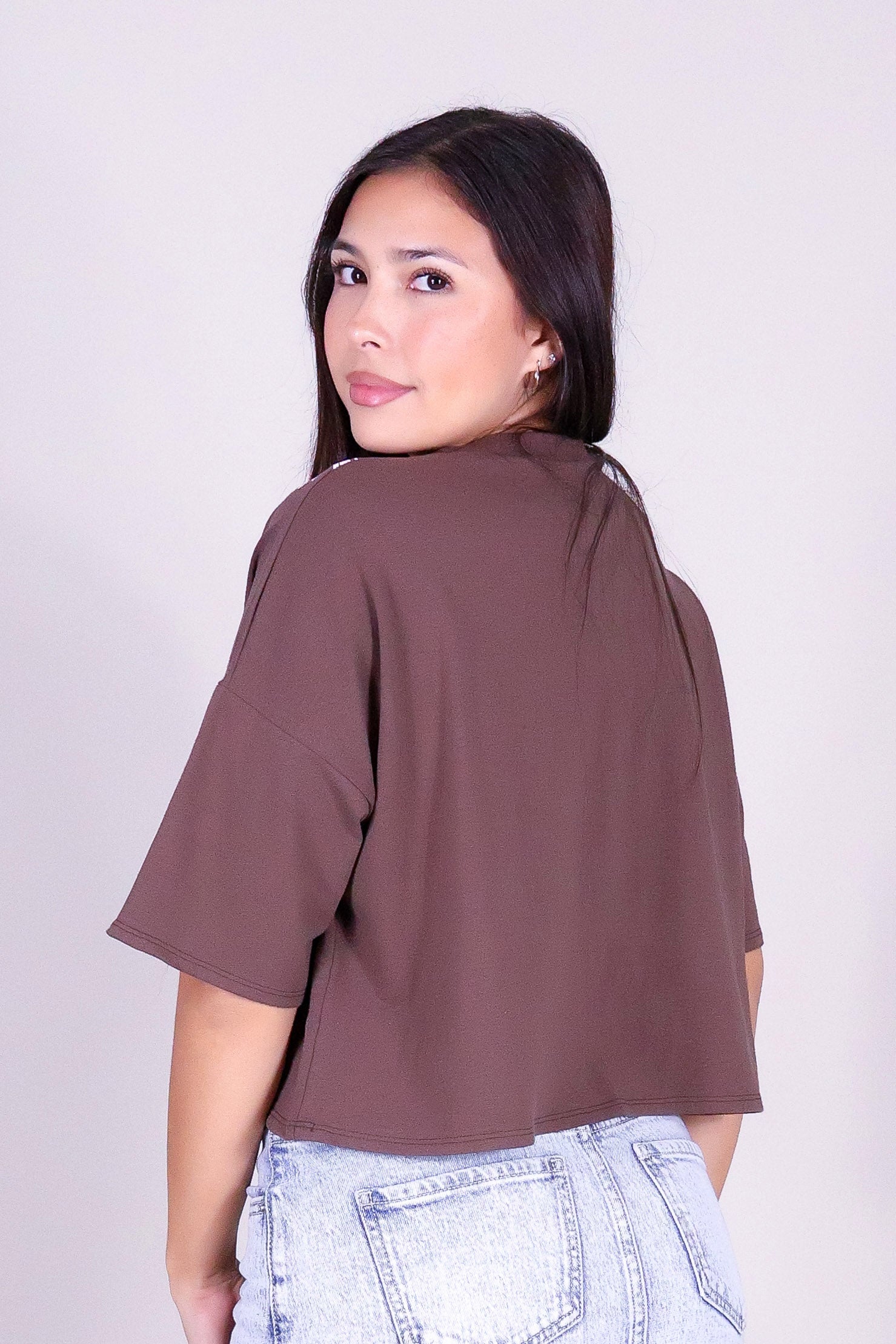 PLUMERIA LEI CROP TEE is available in color BROWN and in size SMALL, MED, LARGE, XL.