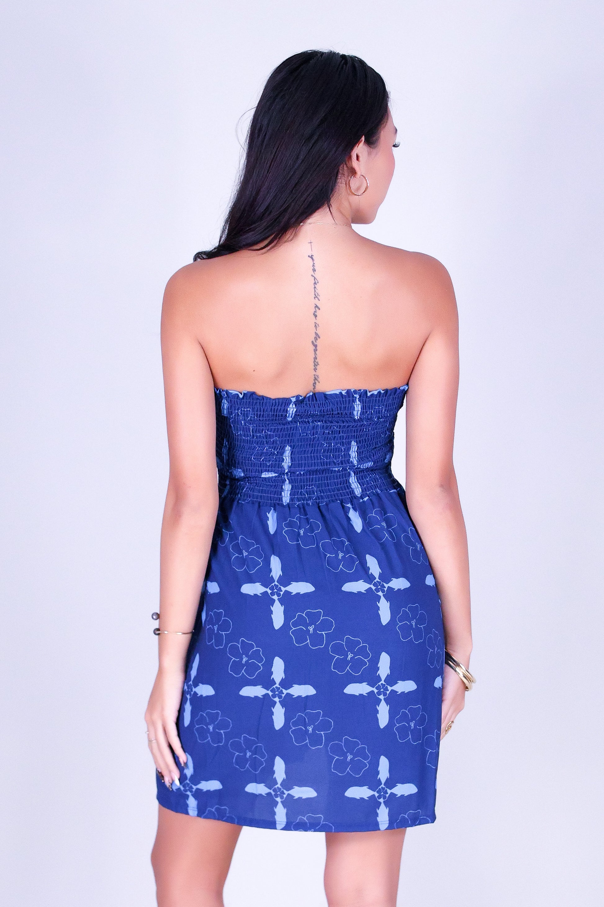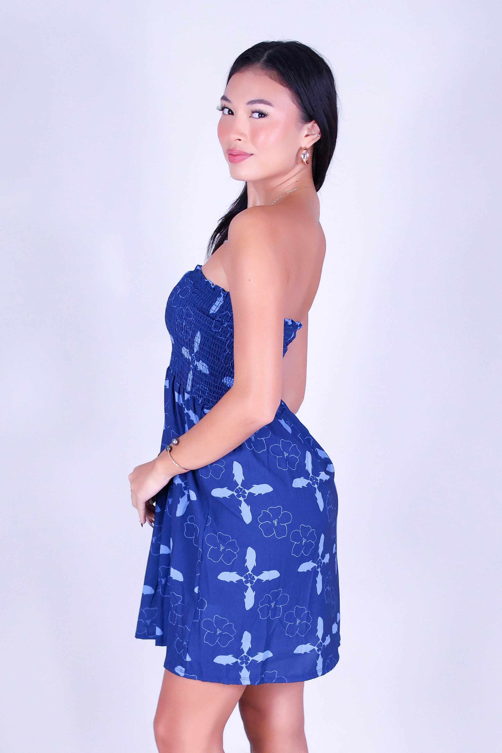ULUA QUILT SMOCKED BABYDOLL DRESS is available in color NAVY and in size SMALL, MED, LARGE.