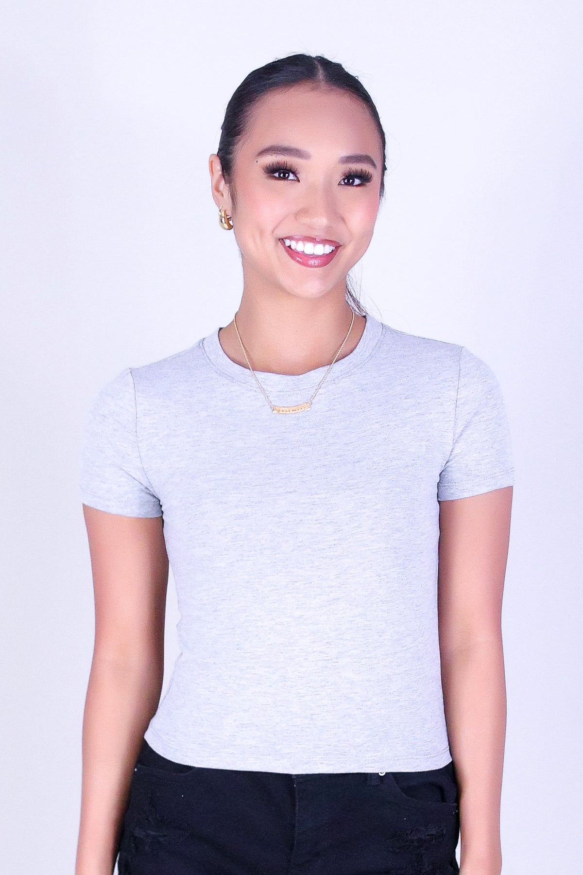 DOWNTOWN BASIC TEE is available in color H.GREY and in size SMALL, MED, LARGE.