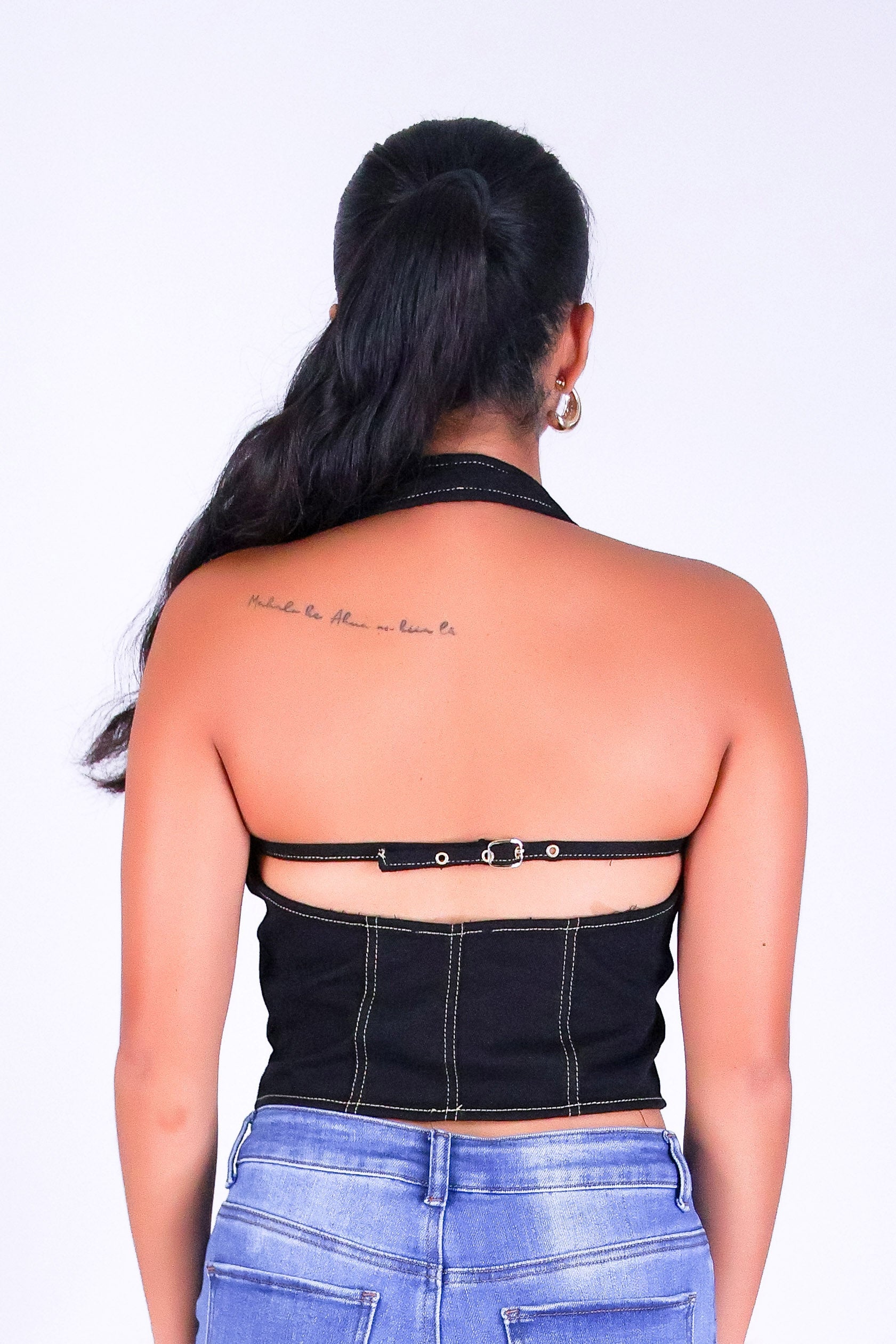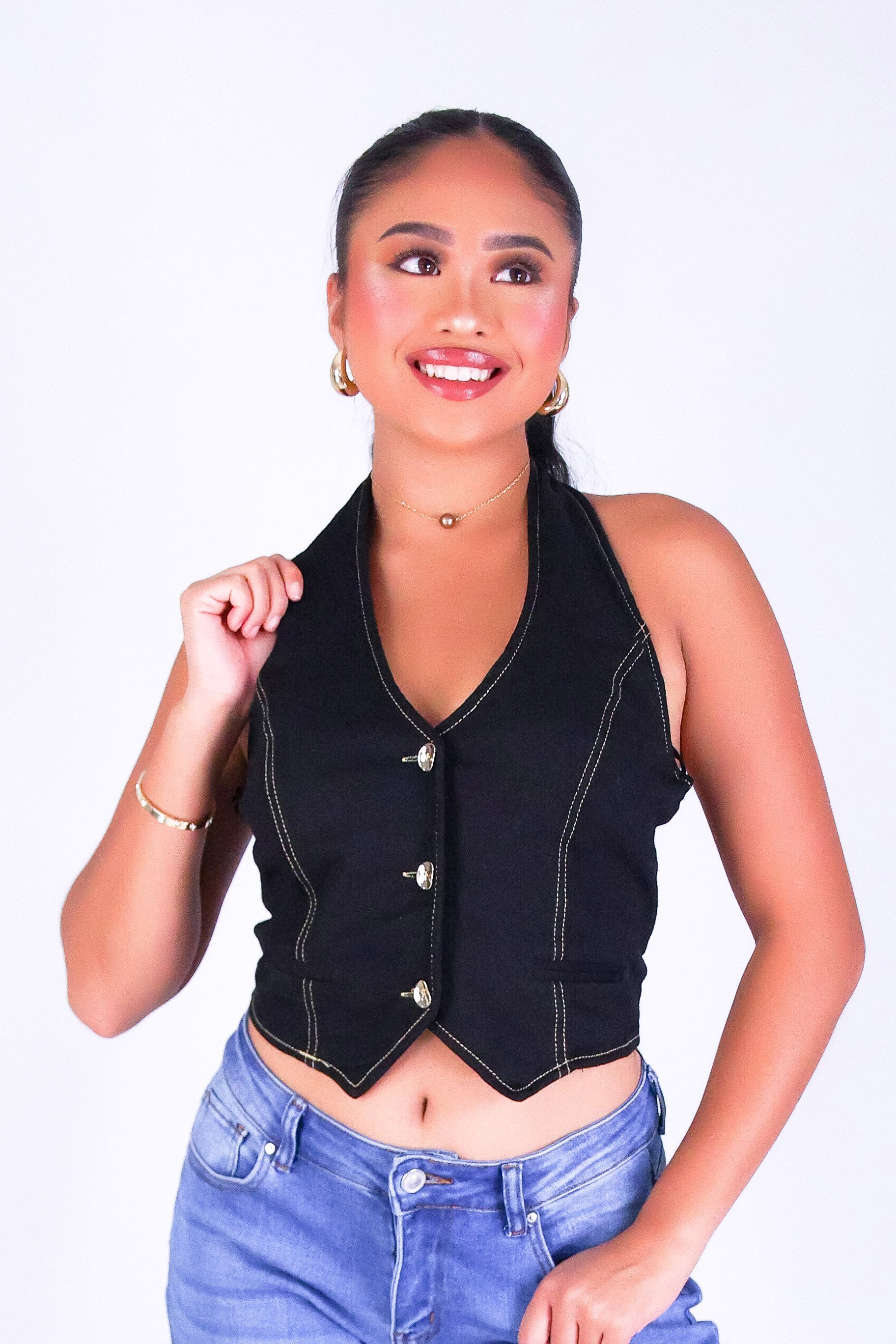 DENIM DIVA HALTER VEST TOP is available in color BLACK and in size SMALL, MED, LARGE.